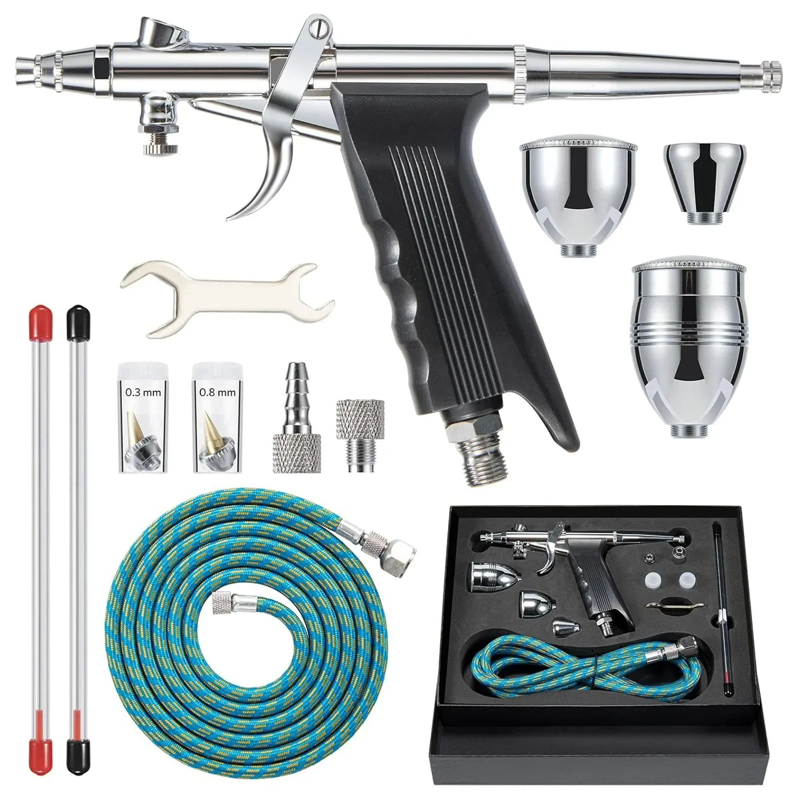 Airbrush Kit with Double Action Trigger, 0.3/0.5/0.8mm Needles, 2/5/13cc Paint Cups Airbrush Gun Ideal for Nails Cake Tattoo Art