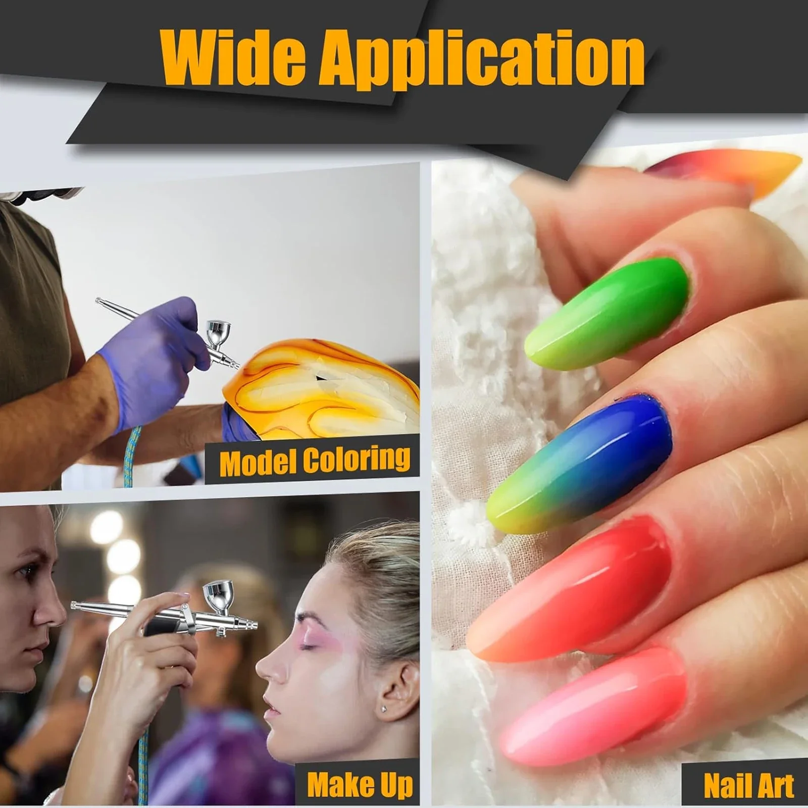 MULTIFUNCTION AIRBRUSH SET: Whether it's a novice or a professional can easily use this airbrush kit. Ideal for painting, nail art, make up, body painting, cover design, cake decorating, tattoo, model coloring, craft hobbies, ect. All the airbrush fittings are storaged in a portable box, meeting your different needs