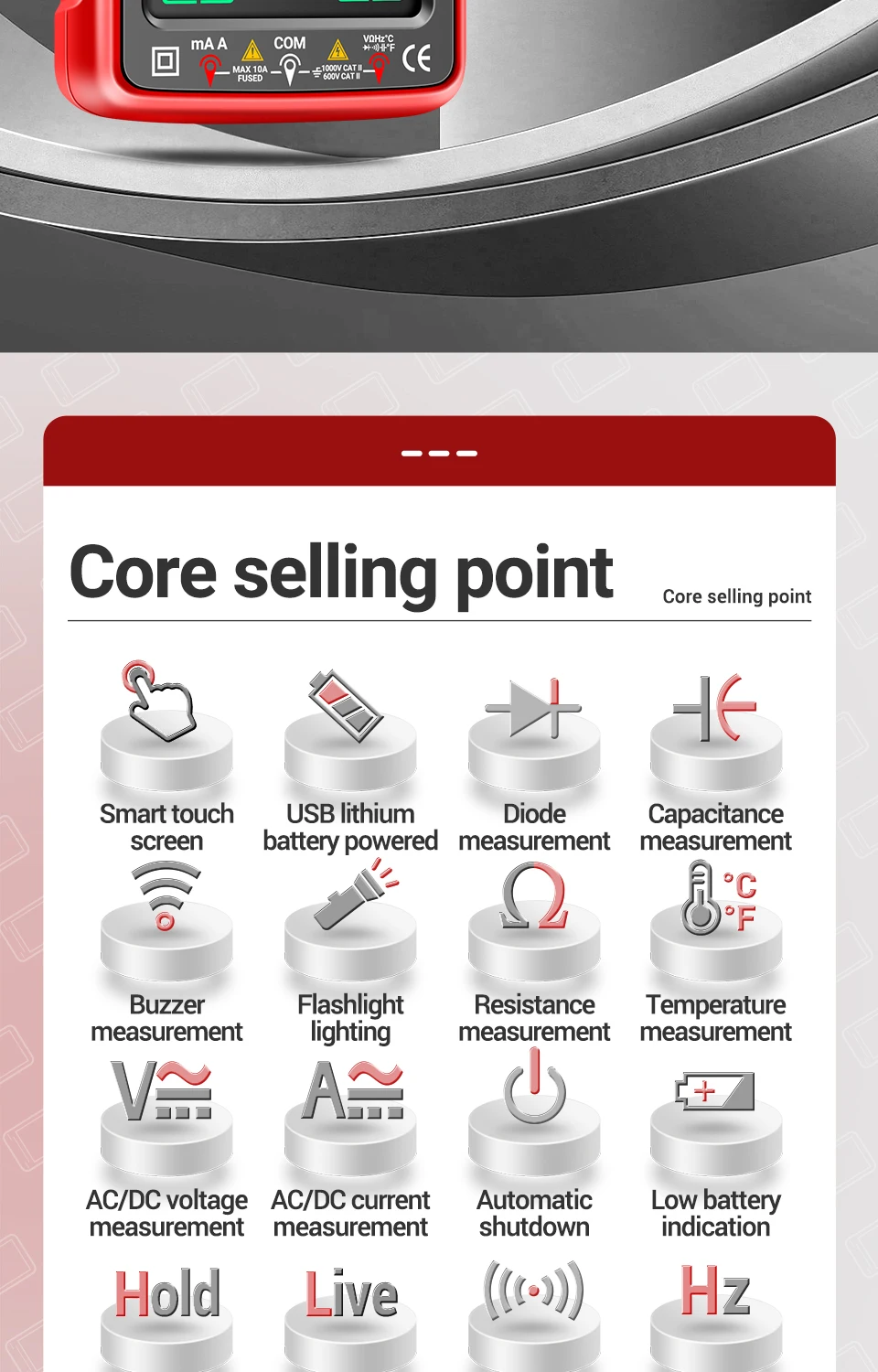 It can be used to measure DC voltage,AC voltage sine RMS,DC Current,AC current sine RMS,resistance,capacitance,live-line indication,duty ratio,diode on/off test,symbol unit ,data hold and automatic power off.