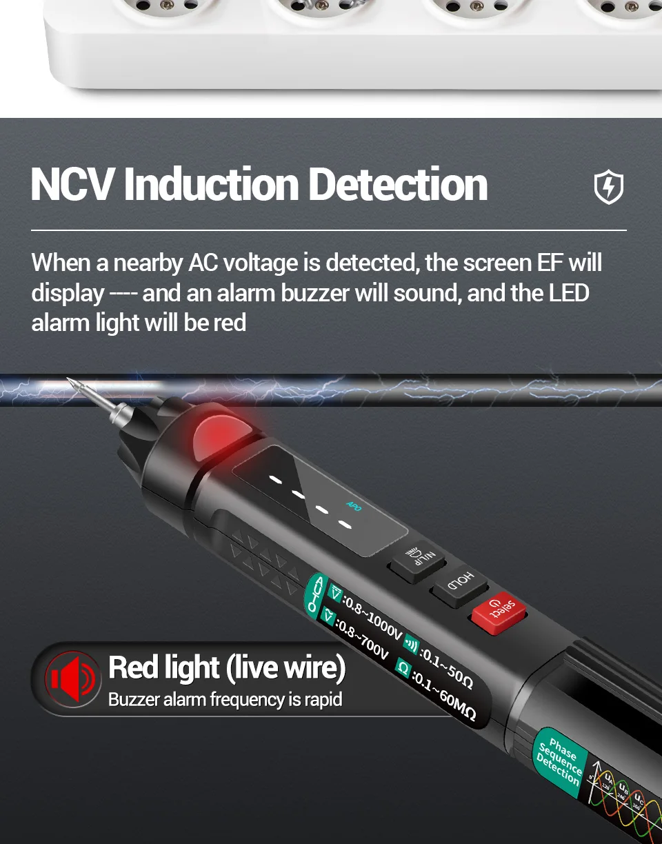 7. Test functions: DC voltage, AC voltage, diode, resistance, capacitance, Hertz, data holding, zero fire line detection, flashlight, on-off buzz, automatic shutdown, acoustic and light screen alarm, current temperature detection, non-contact induction