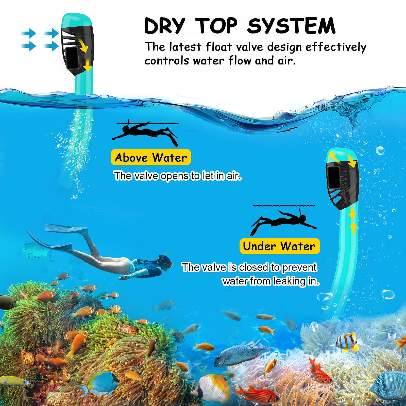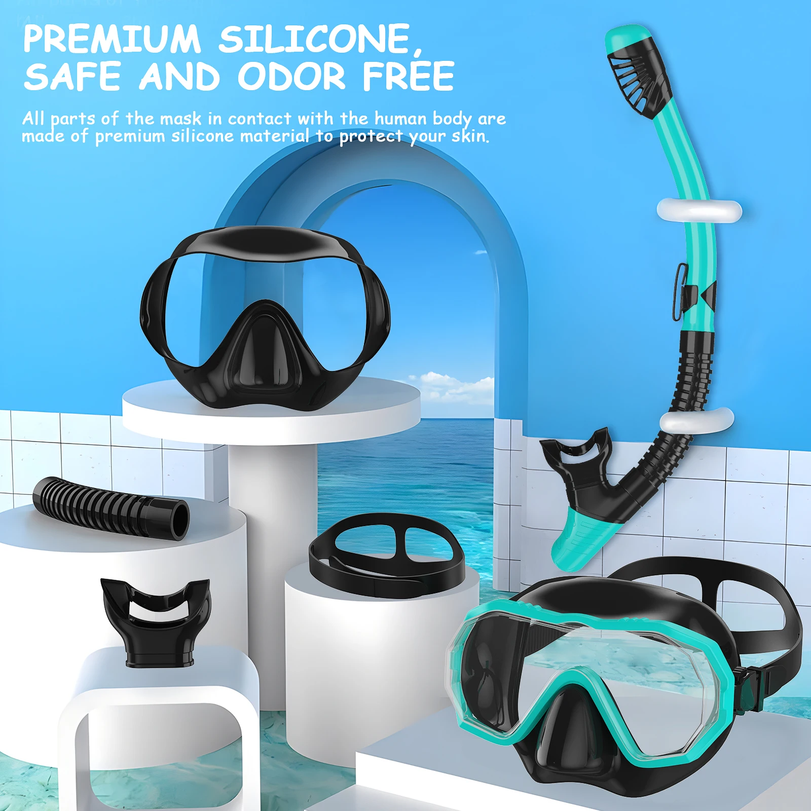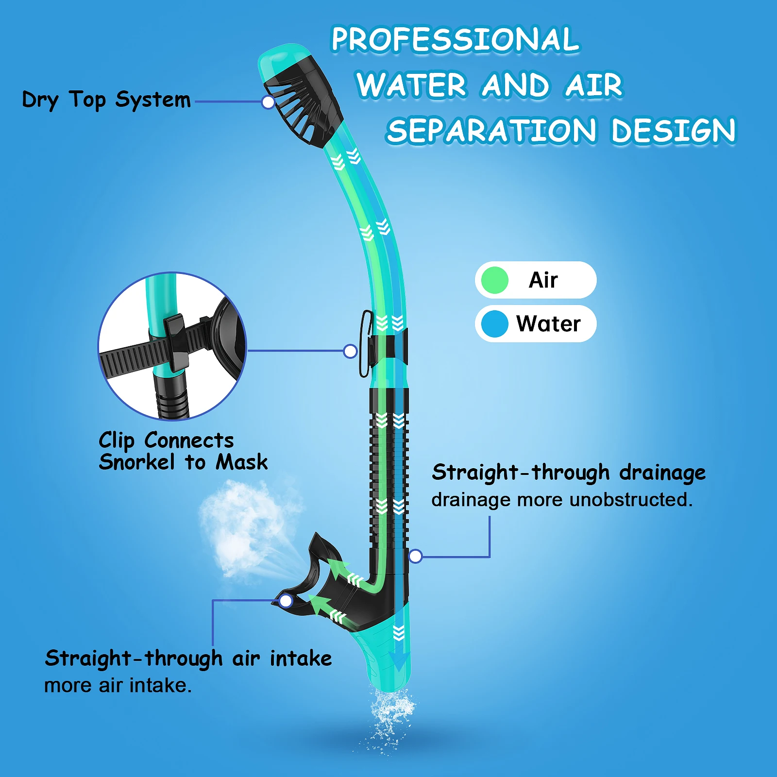 - Comfort-fit soft skirt for water-tight seal,comes with fully adjustable head straps.100% silicone snorkel mouthpiece bends easily and reduces jaw fatigue, epecially suitable for long-term snorkeling,swimming and scuba diving.