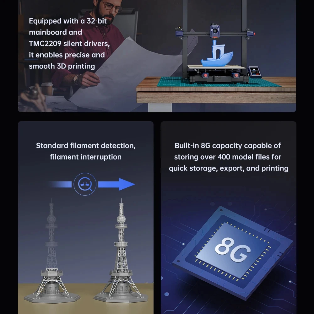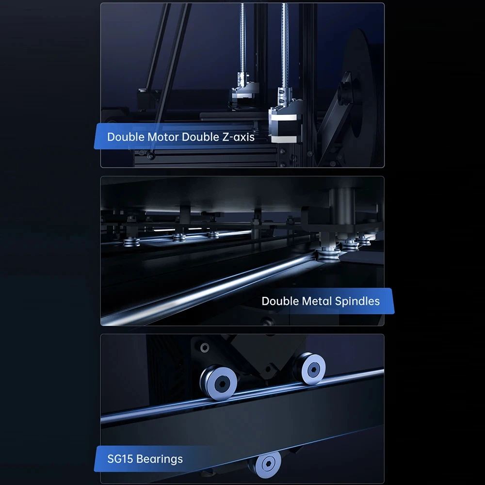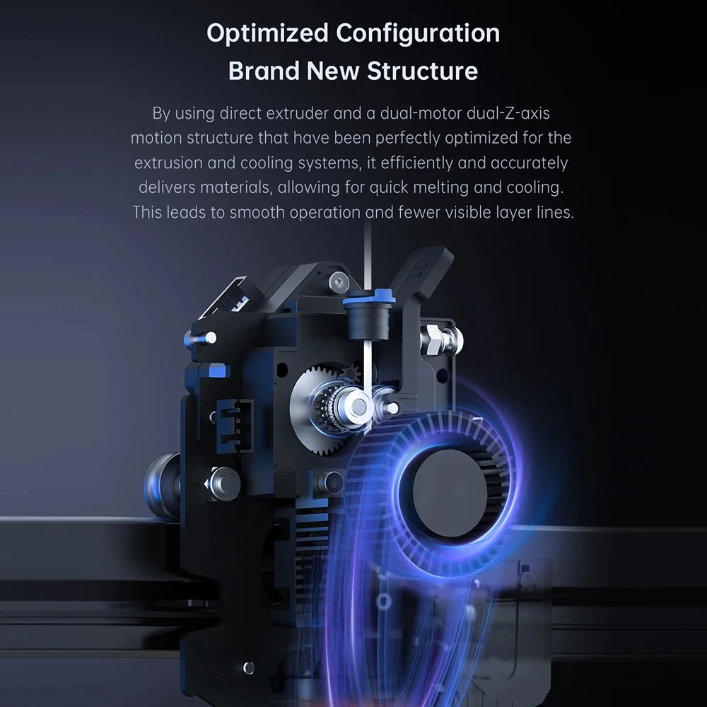4.Brand New Structure:By using direct extruder and a dual-motor dual-Z-axis motion structure that have been perfectly optimized for the extrusion and cooling systems, it efficiently and accurately delivers materials, allowing for quick melting and cooling. This leads to smooth operation and fewer visible layer lines.