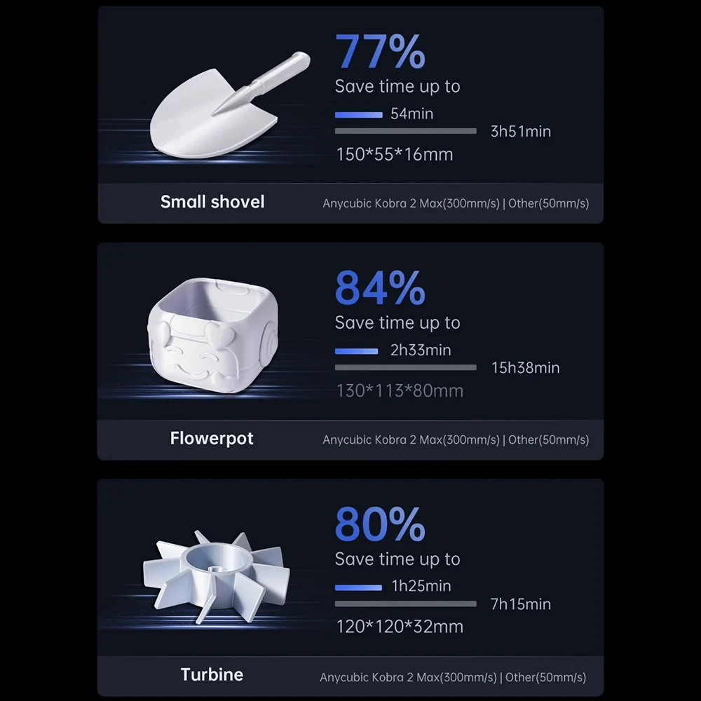 1.10X Faster Excellent in detail:Max engraving speed up to 500mm/s. Compared to mainstream FDM 3D printers, the printing speed has increased by 10 times. Larger model creation, time-saving, and energy-efficient.