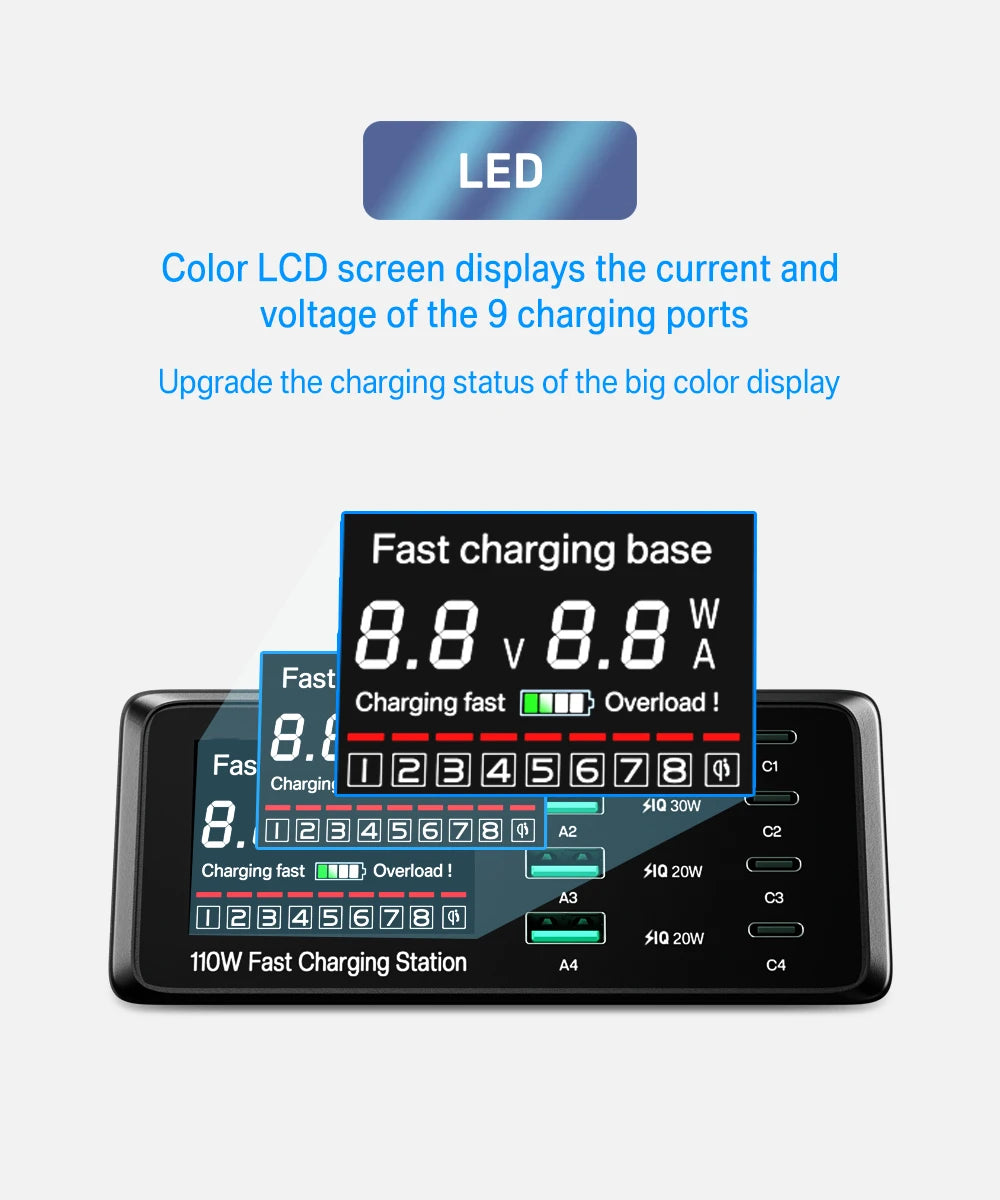 👑This product supports multiple devices fast charging at the same time, the maximum output power is 110W, please do not overload the use.