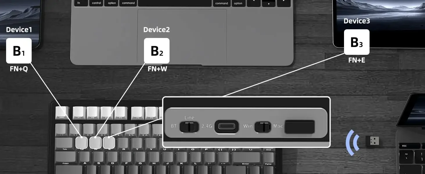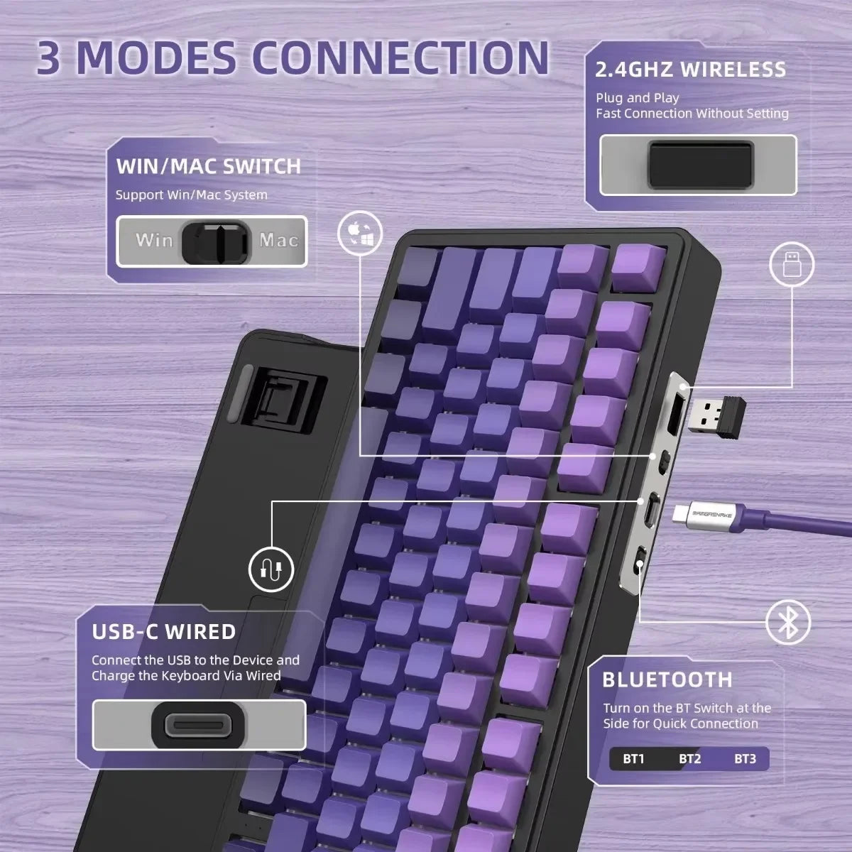 X85 supports Bluetooth or 2.4Ghz for wireless connectivity,or with the USB-C cable.With Bluetooth,the keyboard responses faster and save more power than the former Bluetooth versions.It is also easily switched among the three modes for efficient multitasking.Included 5000mAh battery ensures a long use.Compatible with Win/Mac system.