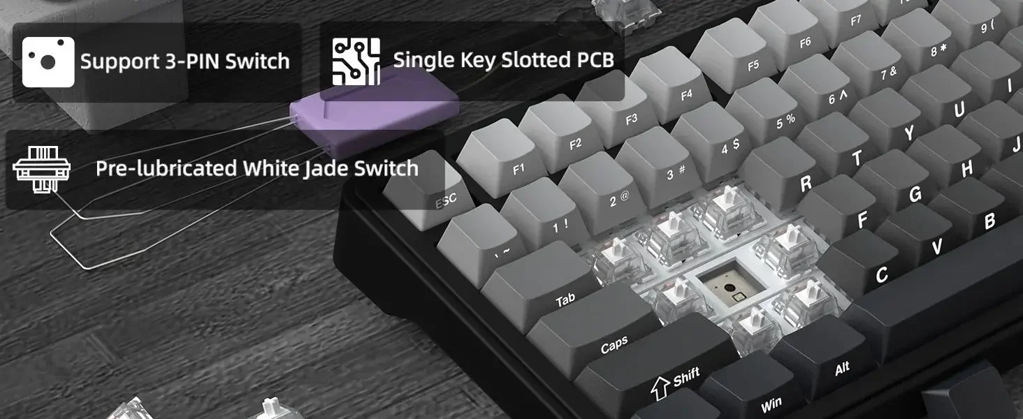 Single key slotted PCB desgin.Supports 3pin hot-swappable.Enjoy the fun of making your own unique keyboard.Linear pre-lubed White Jade Switch is the quiet and comfortable switch.Particularly ideal for long-time use in gaming/work,and well-balanced performance in all aspects.The durable stem is credited to a more smooth and pleasing typing experience.