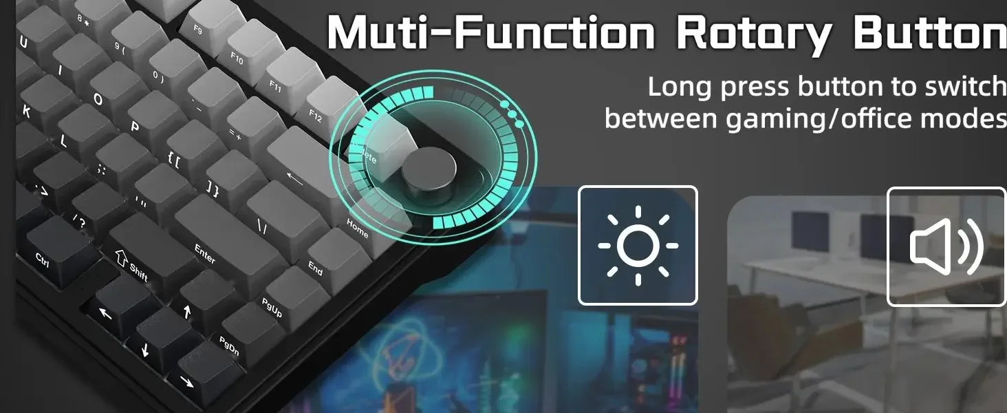 Adopt the most popular 75% AINSI layout,82keys,making it a practical choice for work/gaming. It retains essential arrow and function keys while freeing up desk space.Easy control with the built-in volume knob maded from high-grade CNC aluminum.Press the knob to switch the light and rotate left/right to adjust the volume.