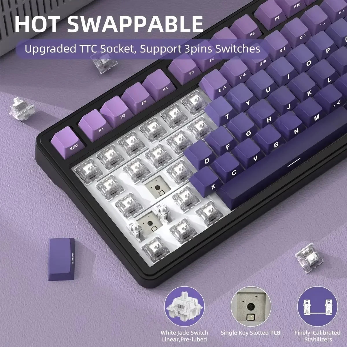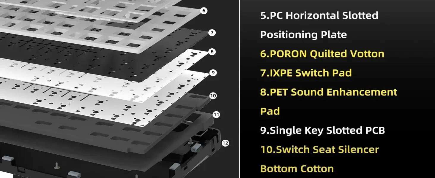 The new upgrade! Built-in 5 layers of sound insulation cotton between the top panel,switch,PCB,and bottom,including: PORON Sandwich Cotton, 8 × IXPE Switch Pad, PET Sound Absorbing Foam, Sponge Case Foam, Bottom Silicone Pad.Noise is maximally reduced,It achieve an ultimate soft,pure sound and smooth typing experience.