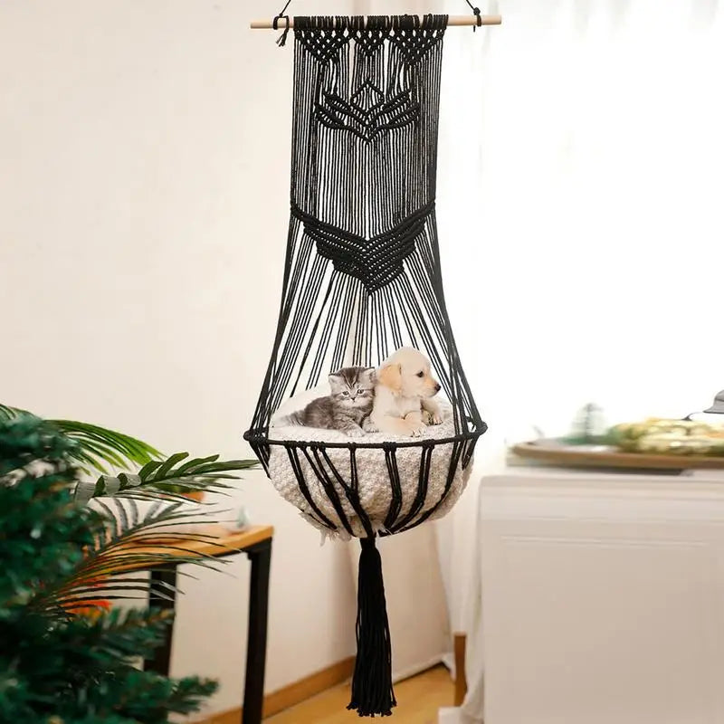 Boho Cat Swing Bed Hand-Woven Bohemia Cat Bed Kitten Hammock Bed Space-Saving Swing Bed For Home Living Rooms Balcony Bedrooms