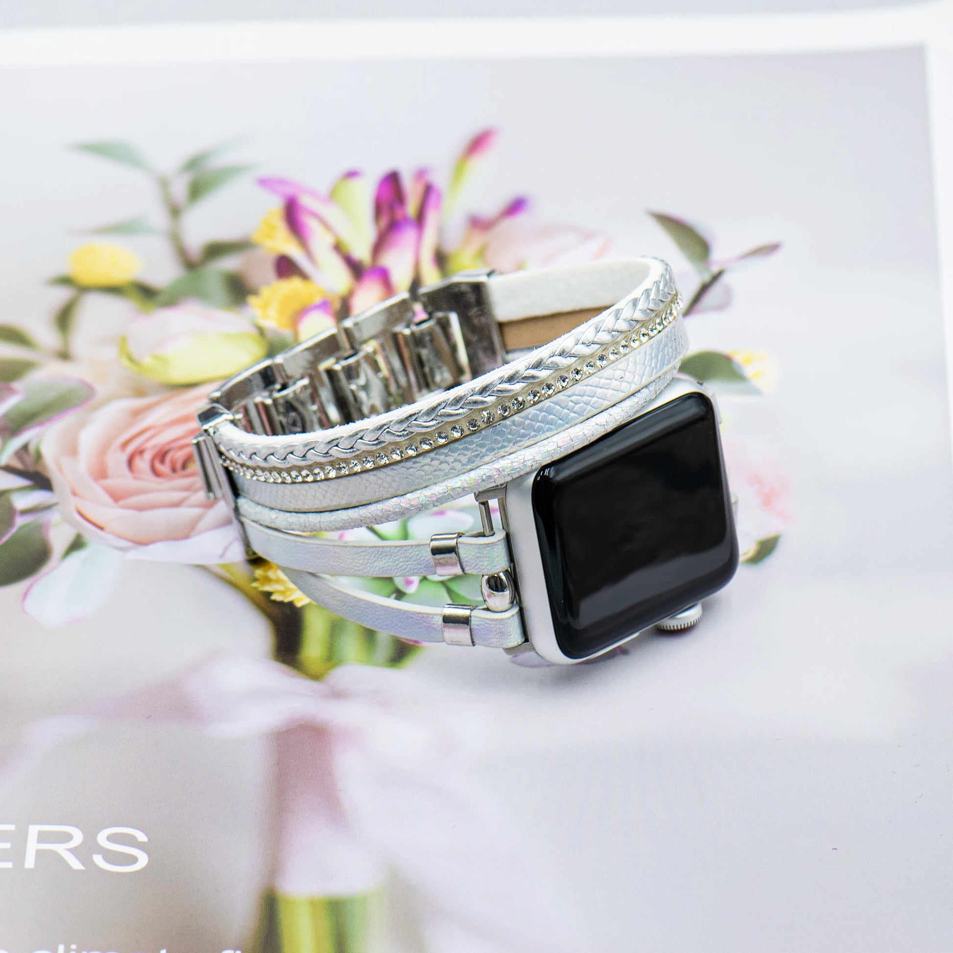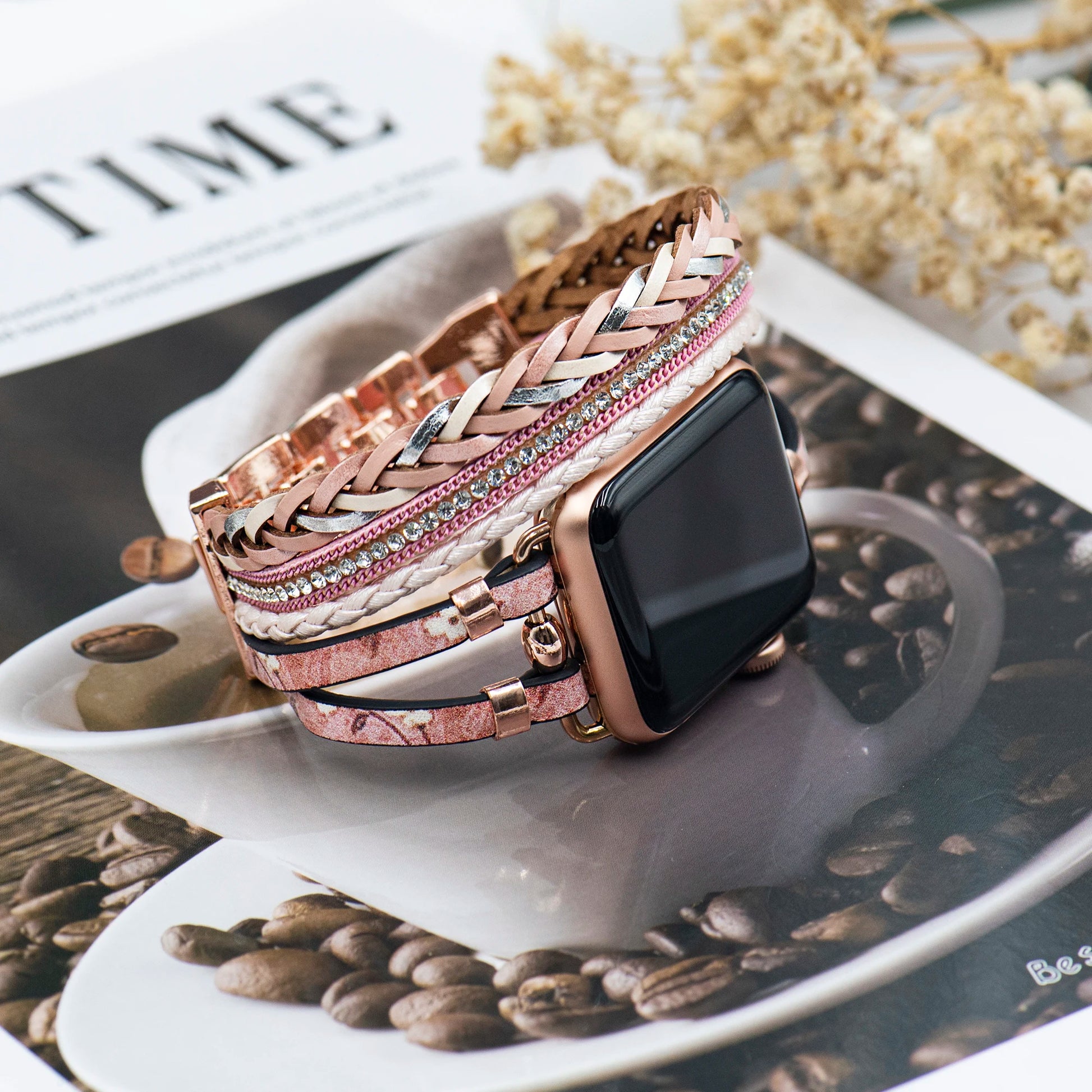 Boho Leather strap for apple Watch strap, men and women 38mm/40mm/41mm 42mm/44mm/45mm/49mm, stylish hand-printed leather strap