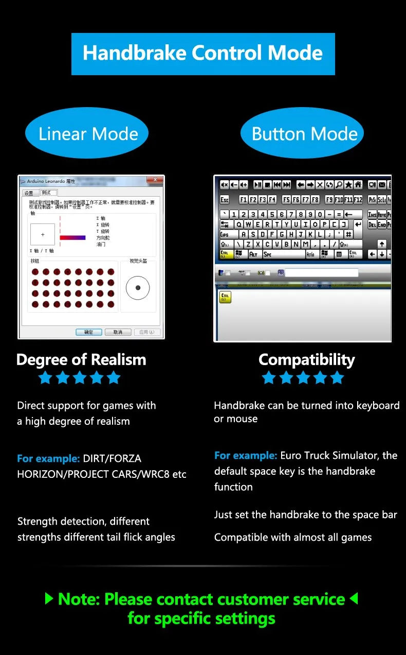 3.Pls contact us if you want use the handbrake to play with game as button, we will help you to set and use it.
