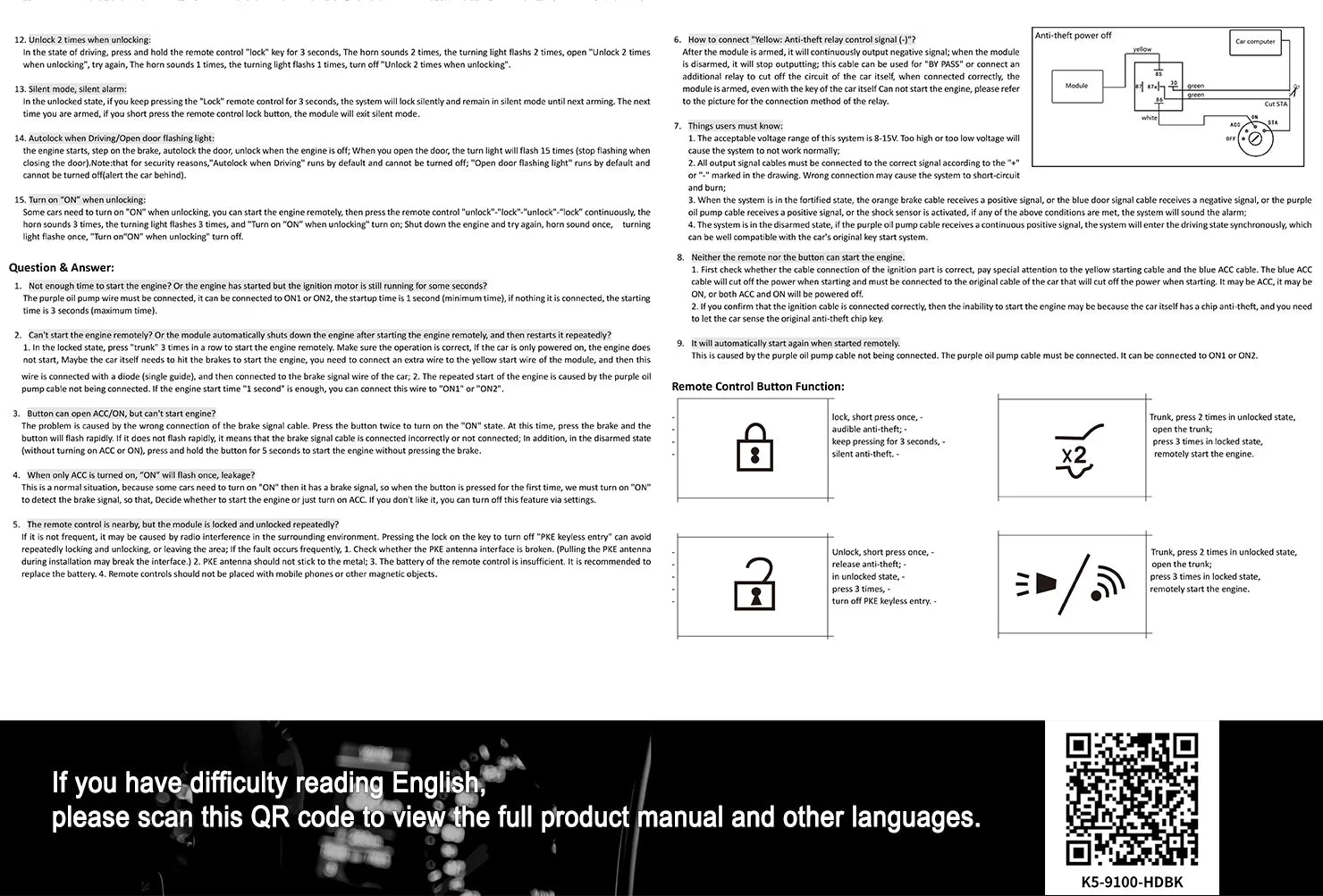 2. Automatic engine lock (the engine cannot be started after locking).