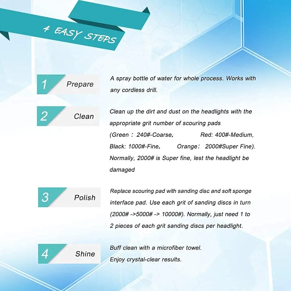 Headlights DIY Polishing kit is easy to store and enough to restore about 4 lamps. Designed for use on headlights, taillights, fog lights, directional lights and more.