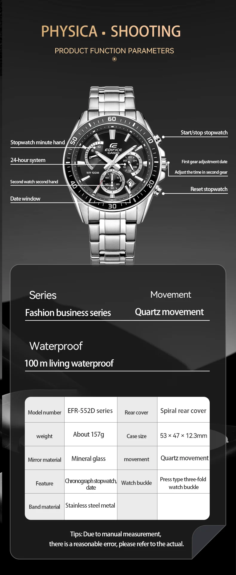 4.100 meters waterproof watch: Stainless steel bezel with high precision seamless technology, waterproof up to 100 meters, can resist splashing or immersion in water for a short time.