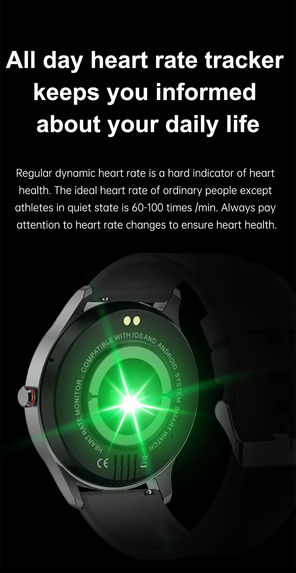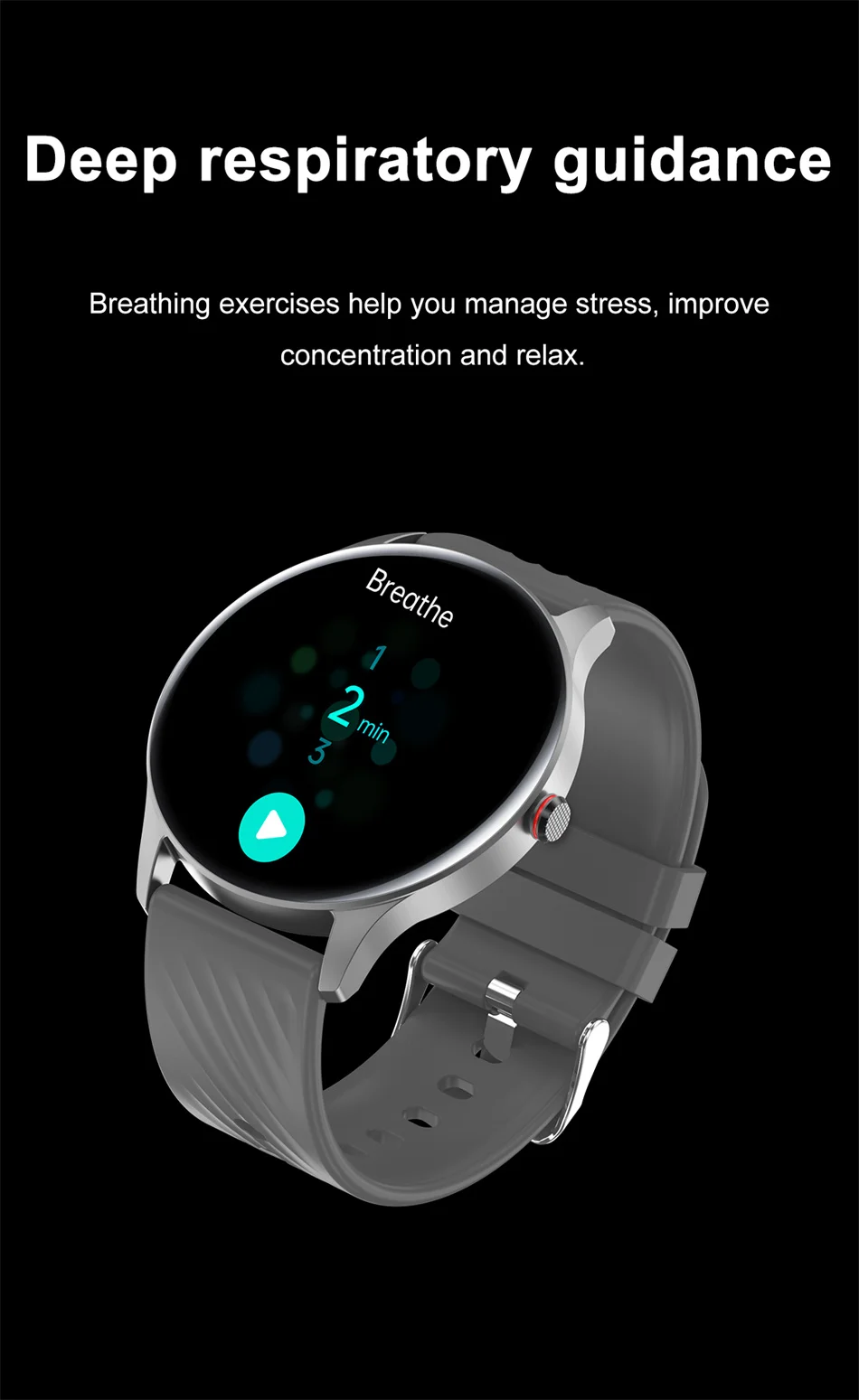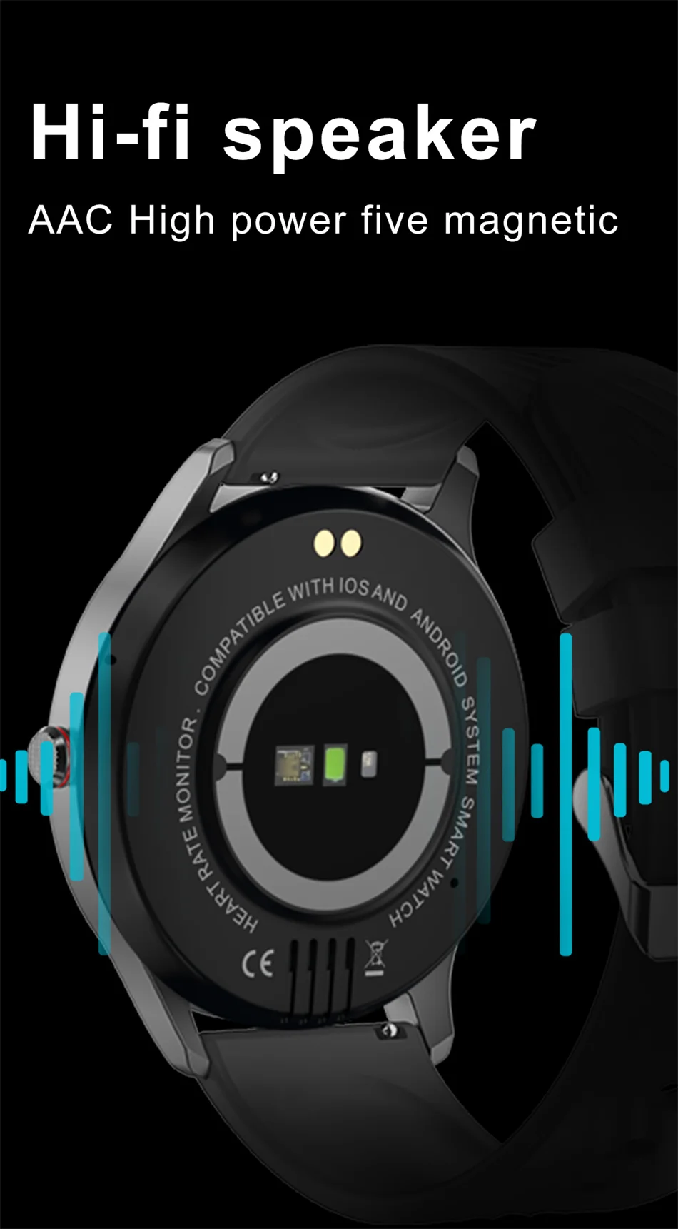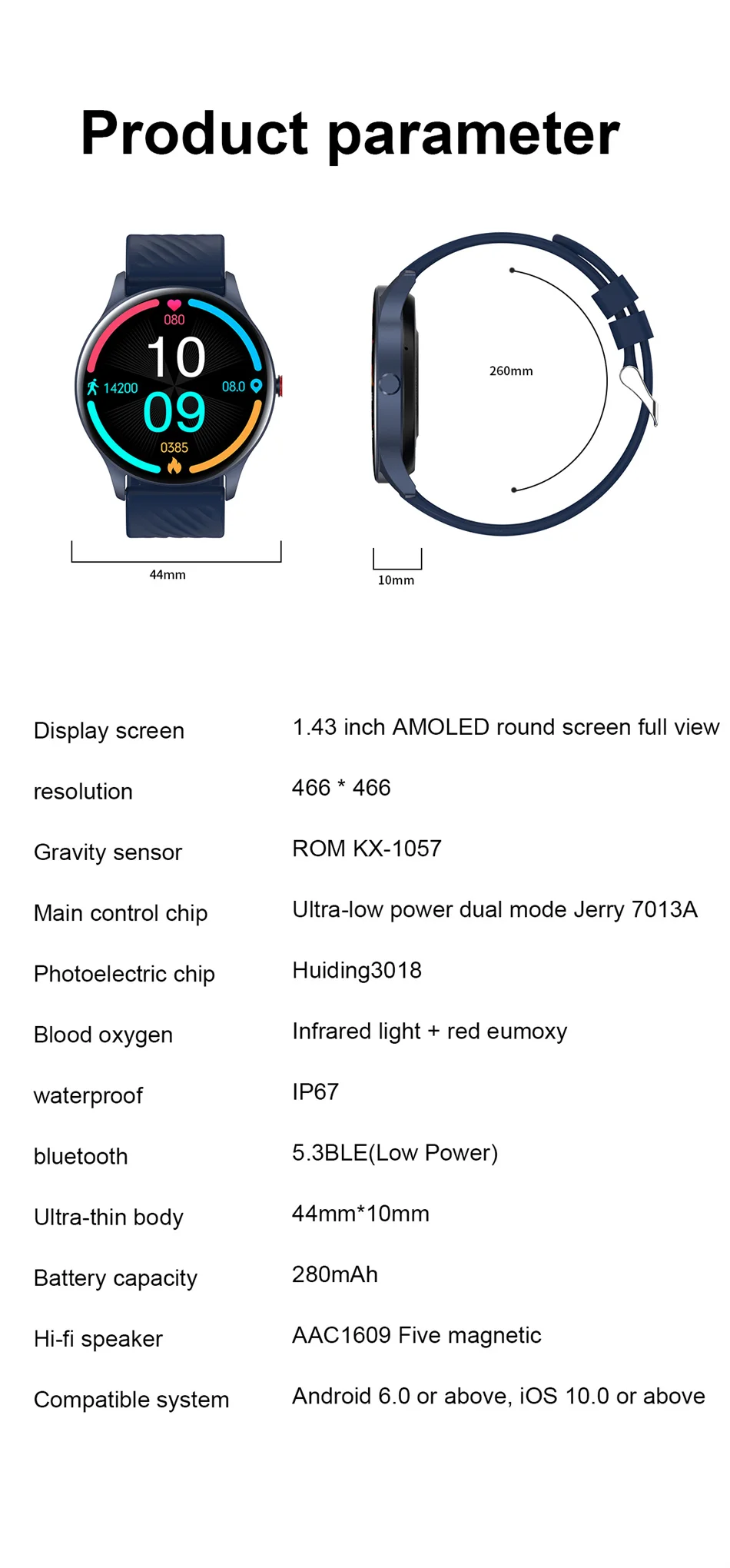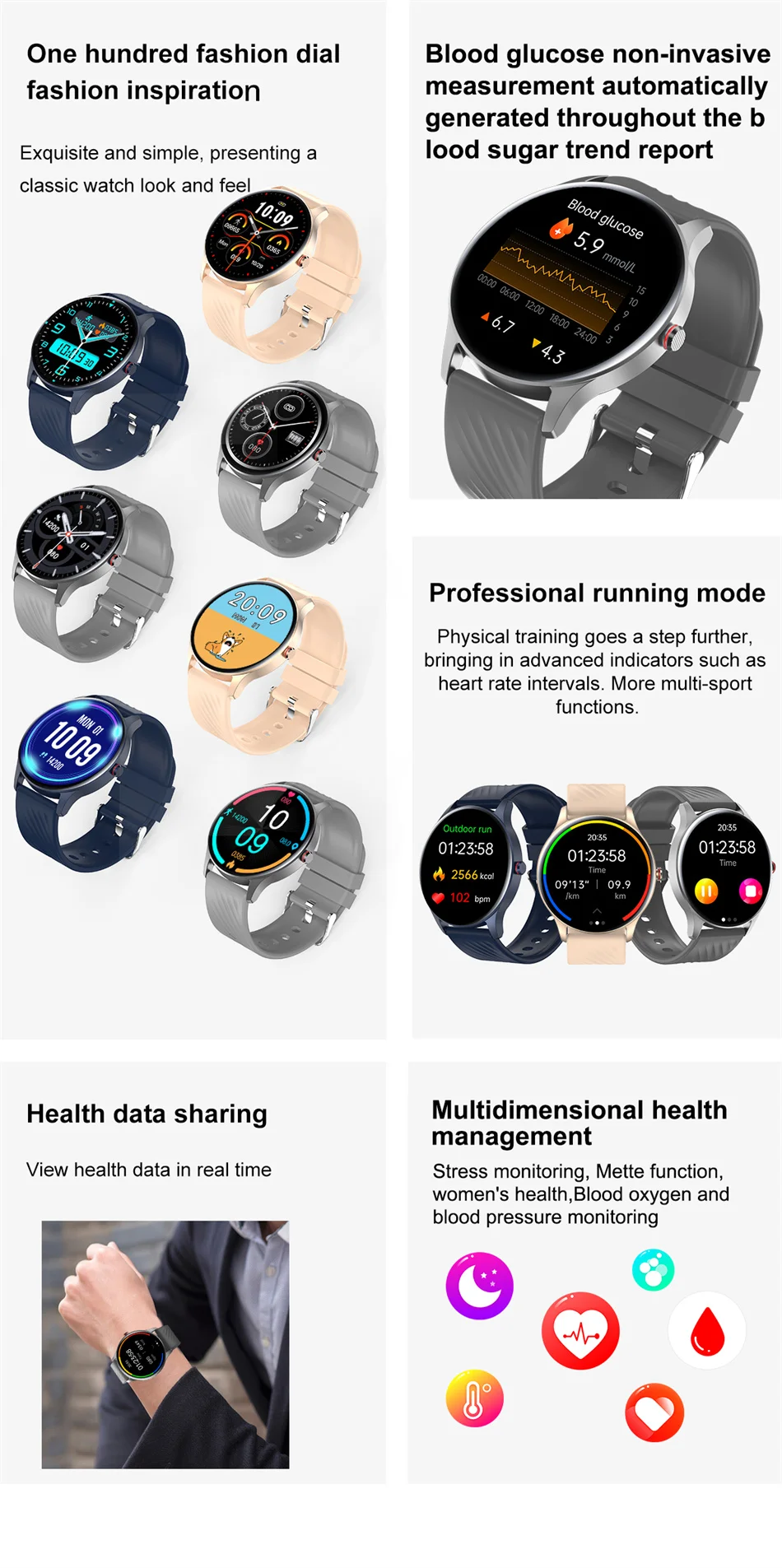 Main functions: Bluetooth call, non-invasive blood glucose measurement, HRV function (Lorentz scatter plot analysis), Maytag function, blood oxygen monitoring, respiratory training, stress monitoring, women's health (period tracking), heart rate monitoring, blood pressure monitoring, 24h REM rapid eye movement test sleep (support sporadic naps over 30 minutes), sedentary reminder and other health functions. Off screen long light clock display, information notification watch end quick setting switch