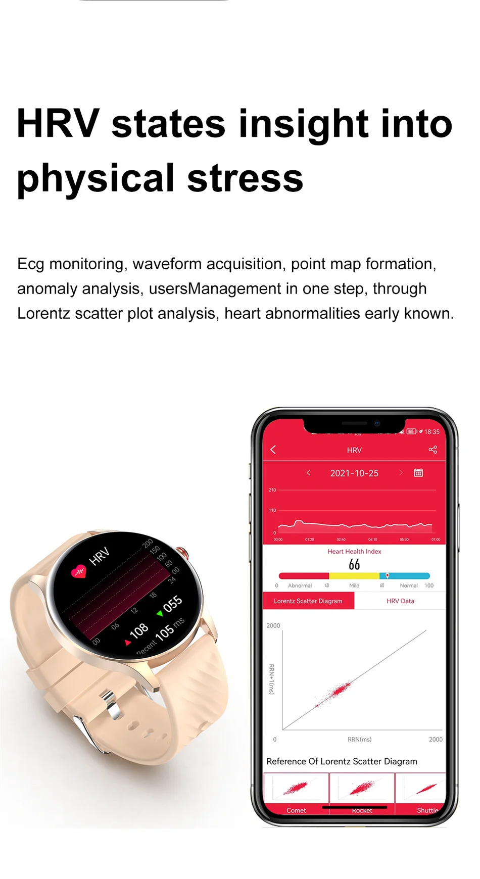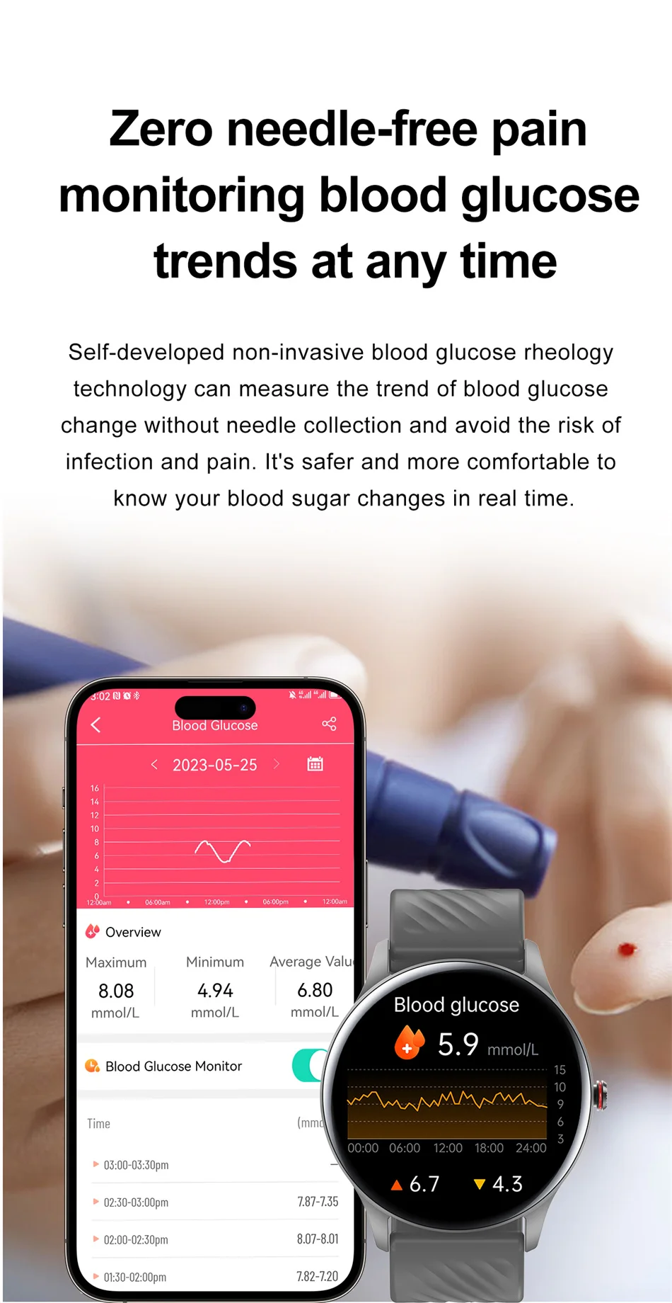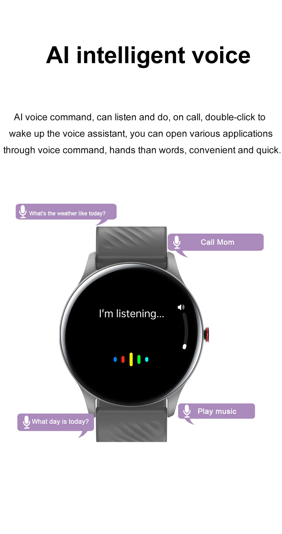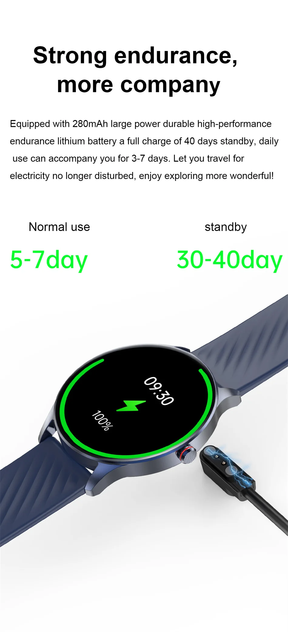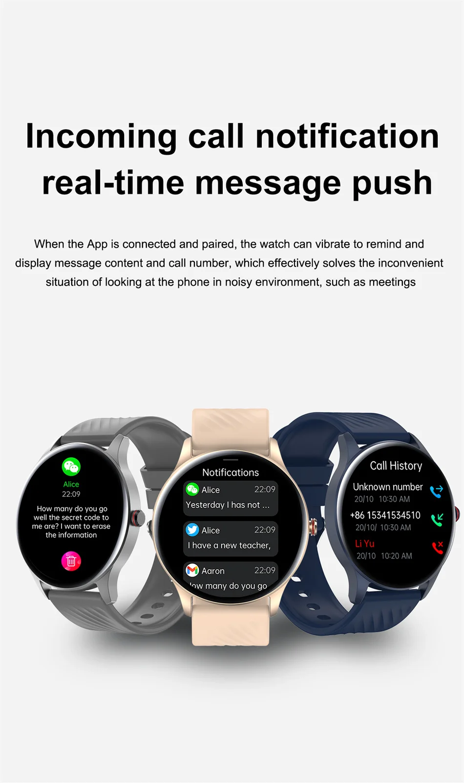 Main functions: Bluetooth call, non-invasive blood glucose measurement, HRV function (Lorentz scatter plot analysis), Maytag function, blood oxygen monitoring, respiratory training, stress monitoring, women's health (period tracking), heart rate monitoring, blood pressure monitoring, 24h REM rapid eye movement test sleep (support sporadic naps over 30 minutes), sedentary reminder and other health functions. Off screen long light clock display, information notification watch end quick setting switch