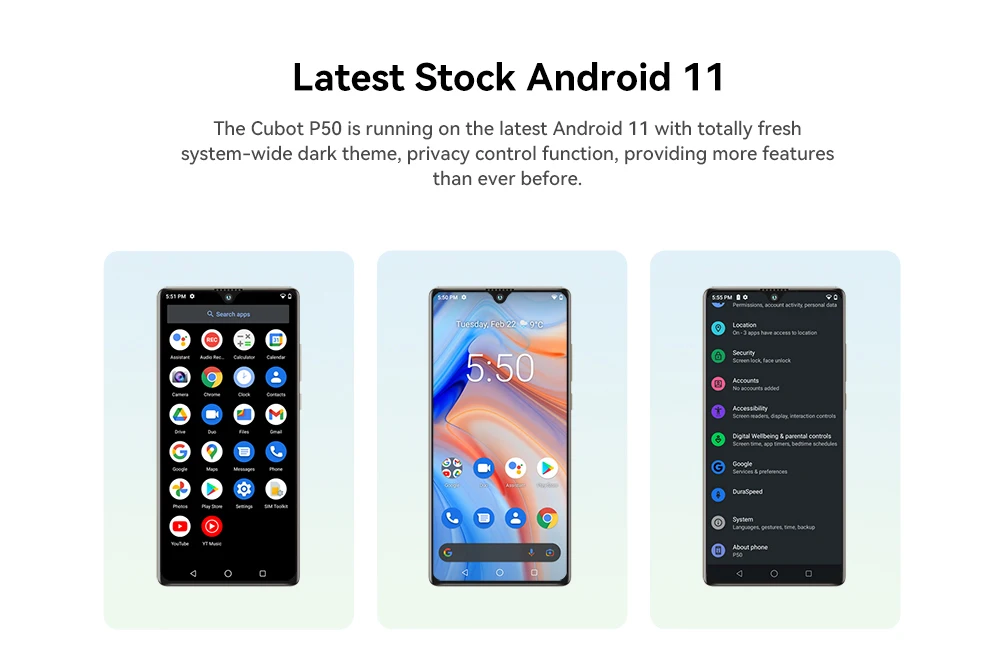 The Cubot P50 is running on the latest Android 11 with a totally fresh system-wide dark theme, and privacy control function, providing more features than ever before.