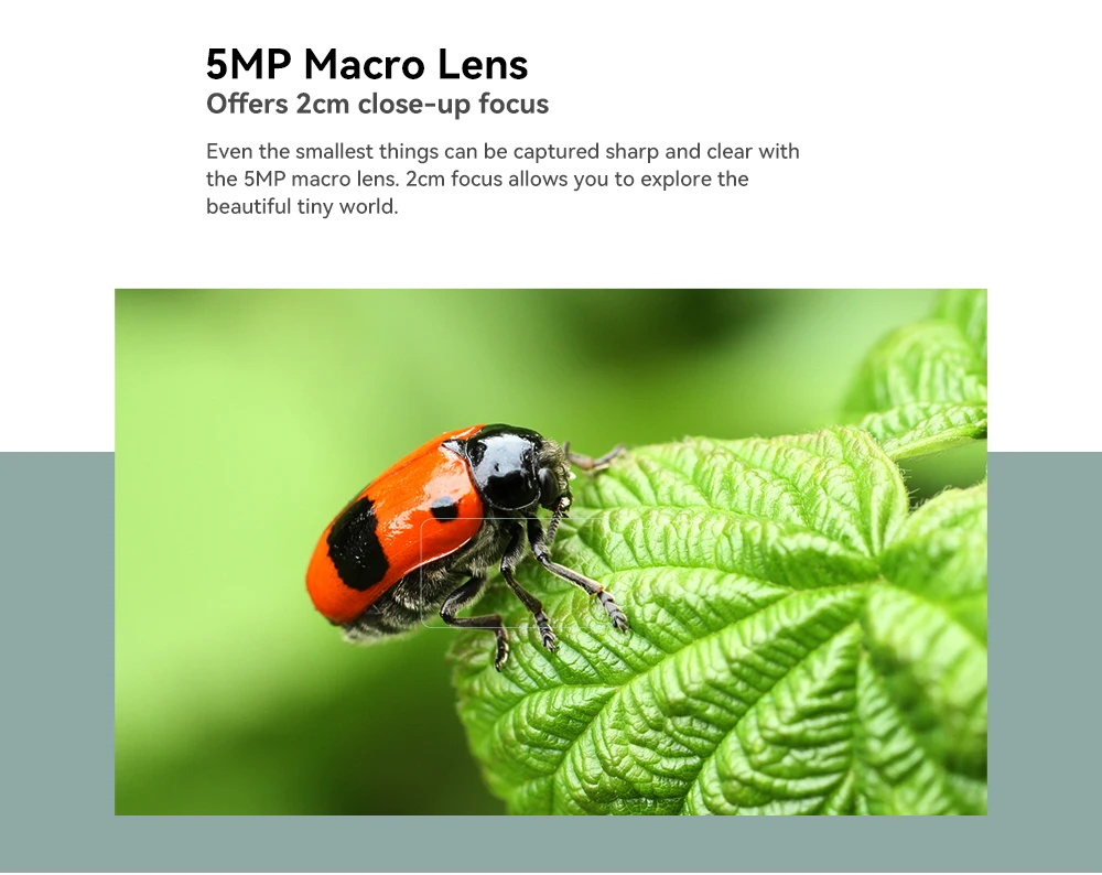 Even the smallest things can be captured sharp and clear with the 5MP macro lens. 2cm focus allows you to explore the beautiful tiny world.