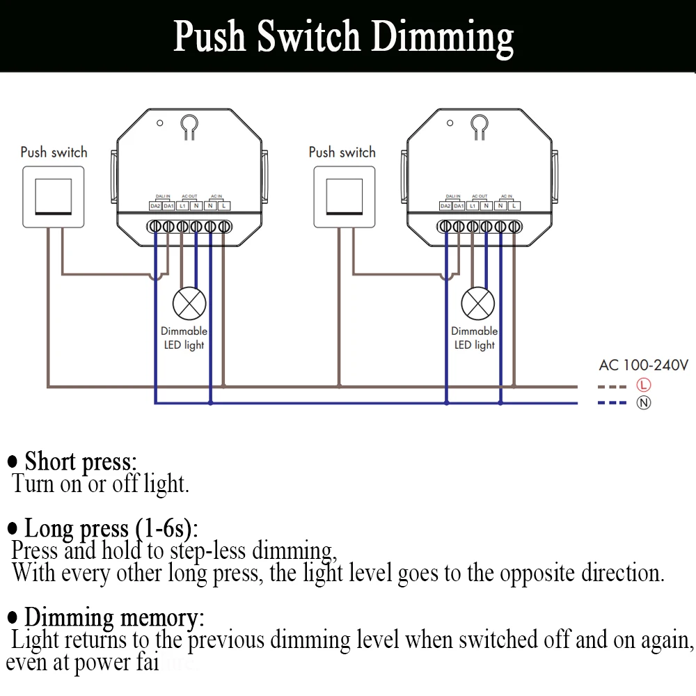 ● Connect with external push switch to achieve on/off and 0-100% dimming function.