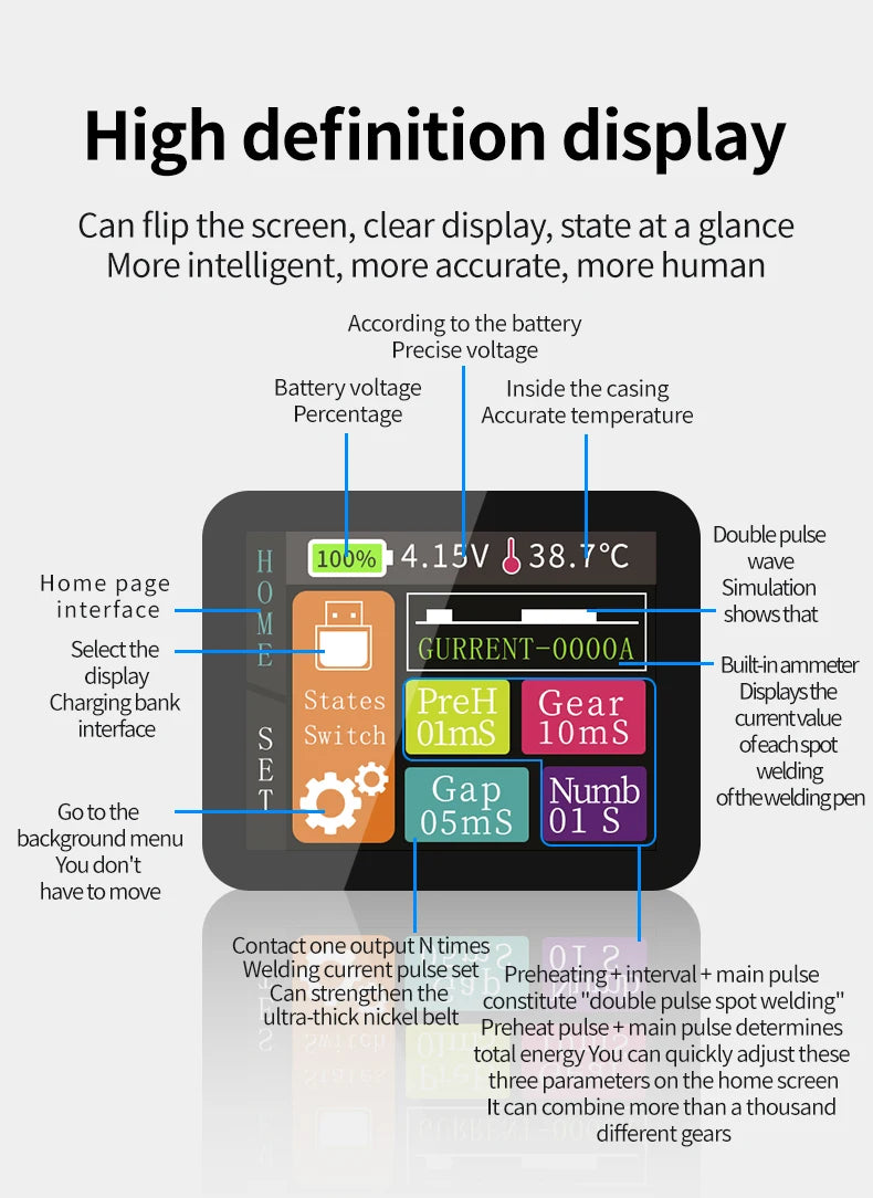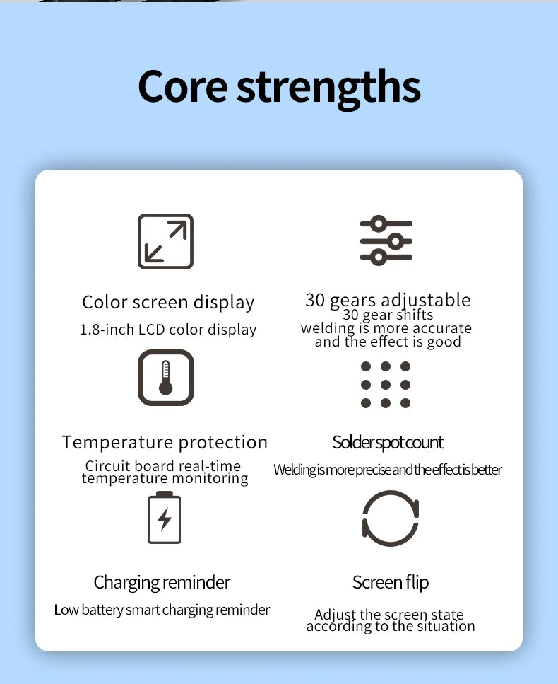 5. Material/Self-inspection function: Made of high-quality ABS and PCB, it has extremely high durability and stable performance, and has a long service life. Advanced power management and software design, no reset and zero return during welding. When the welding pen touches the nickel plate, the self-checking function is automatically triggered, and the response time is 0.8s.