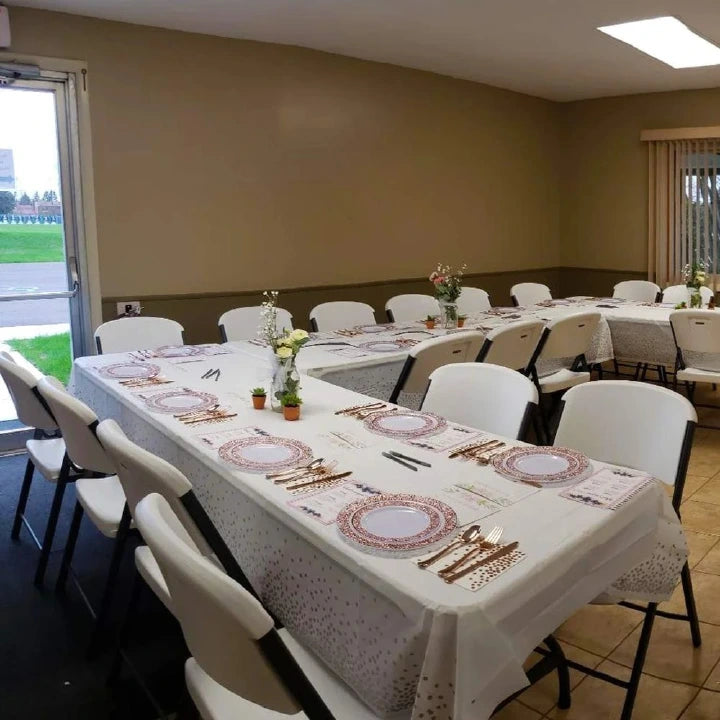 Elevate your next event with this stylish disposable PEVA tablecloth, perfect for rectangle tables. Featuring an elegant black background adorned with shimmering gold confetti dots, it adds a festive touch to any celebration. Designed for convenience, this waterproof and stain-resistant cover ensures quick and easy cleanup after parties, weddings, or bridal showers. Protect your surfaces while enhancing your decor with this practical and decorative table solution.