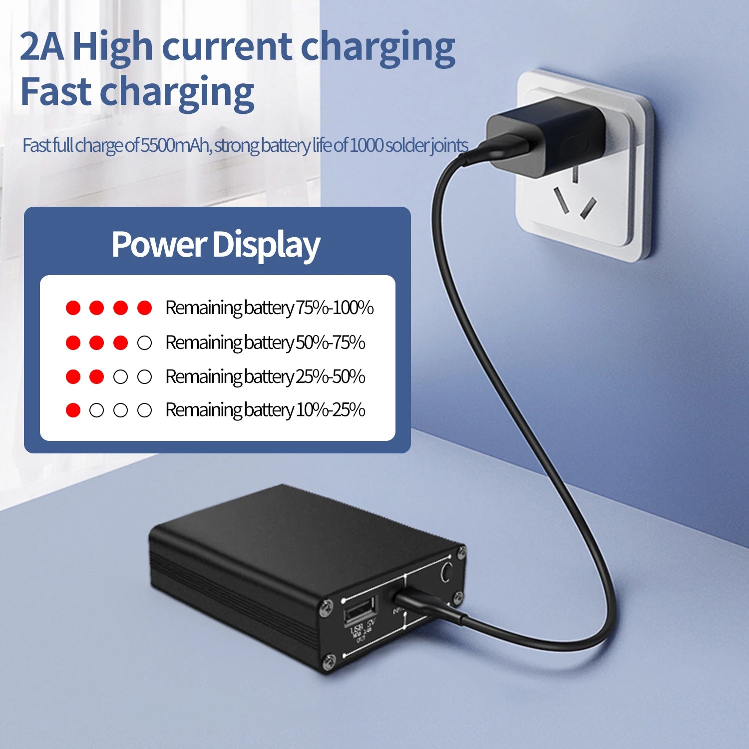 "Welding operation" After inserting the welding pen, firstly use the 1st gear for welding. After placing the welding pen, the host recognizes that the welding is started 0.5 seconds after the welding pen is placed, and then adjusts the gear according to the needs. After restarting, you can connect an external USB charging cable for welding.