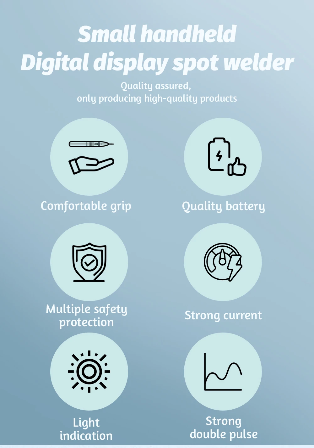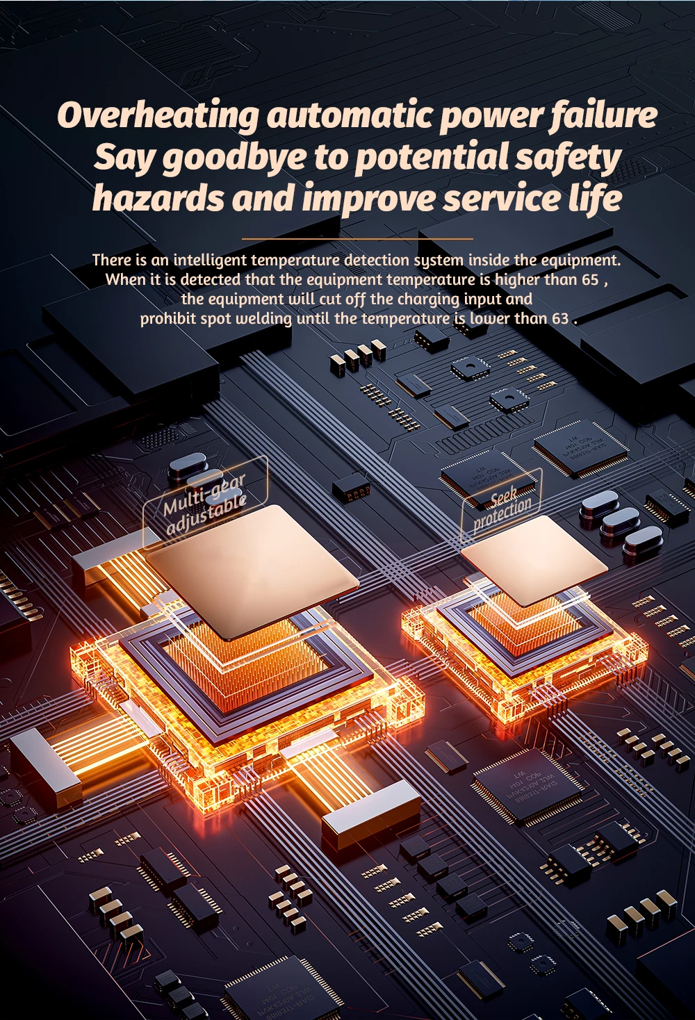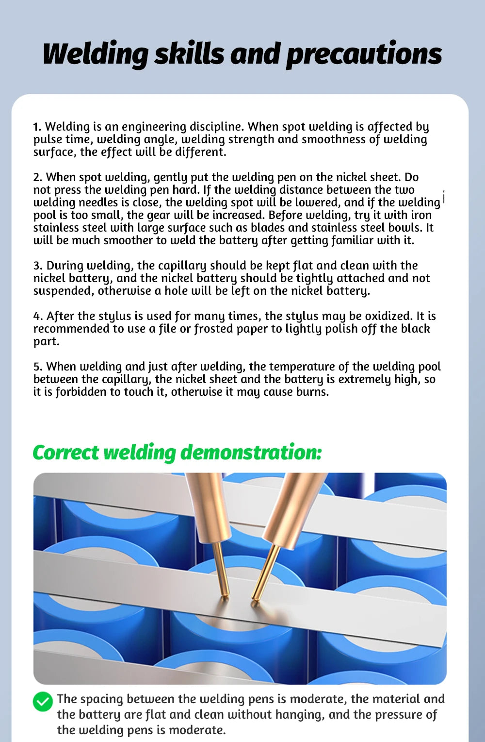 5. Multiple protection measures - although it is a miniature handheld spot welder, it has high-quality polymer batteries, overcharge protection, temperature protection, short-circuit protection, abnormal battery temperature alarm and spot welding shutdown function, and low battery voltage alarm . Ultra-low power consumption, longer standby time.