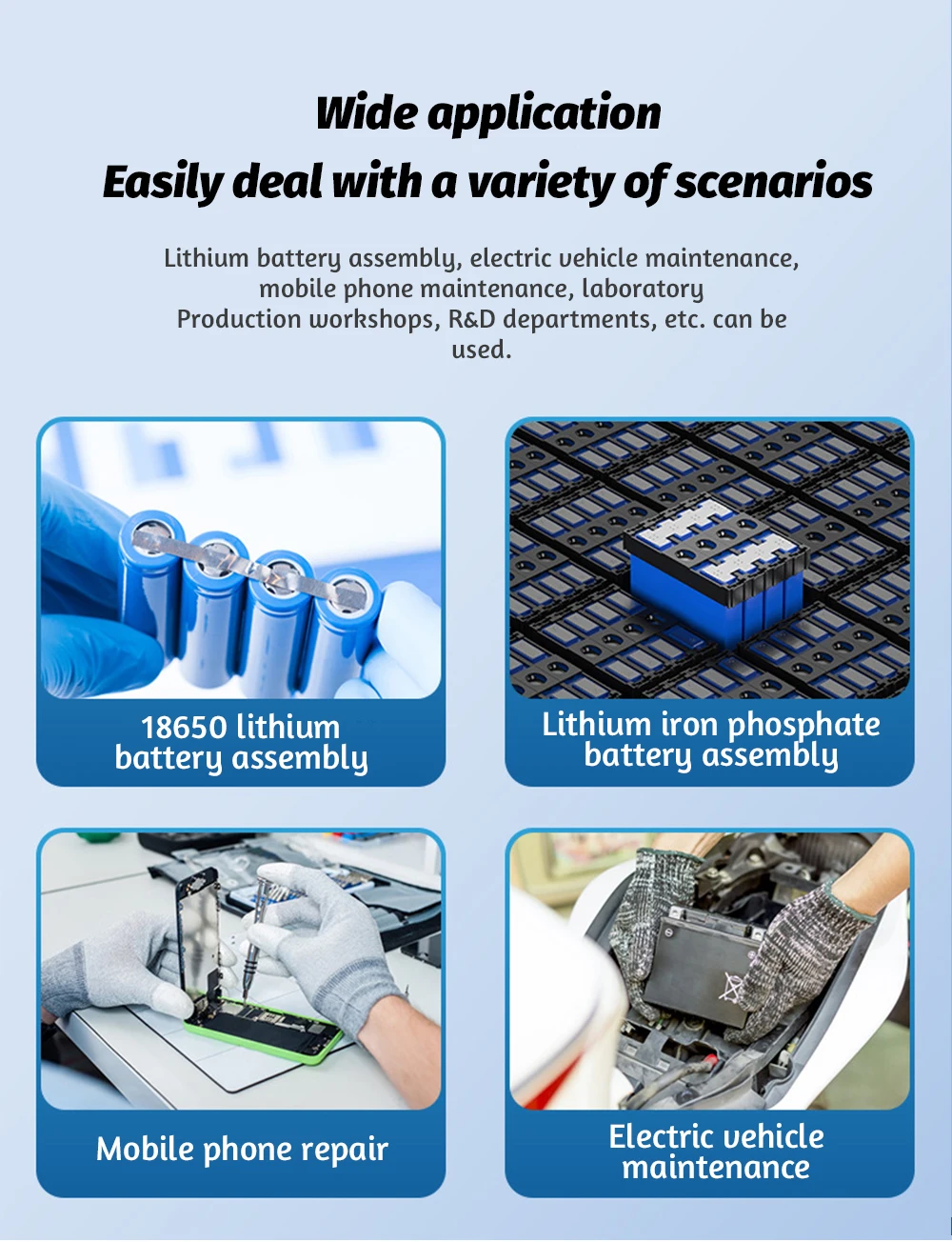 2. Wide range of uses - suitable for 18650/26650/36650 and other cylindrical batteries, mobile phone batteries and electronic devices that require batteries. The spot welding machine can be used for electronic equipment that has been damaged due to battery damage, and can be restored to use after replacing the battery (similar to a handheld electric drill), saving money and environmental protection.