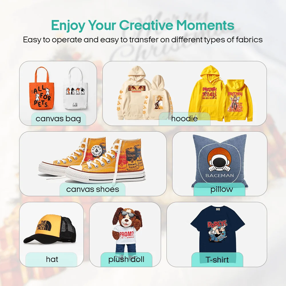 Patterns printed by DTF printers can be transferred to many types of fabrics, such as: pillows, T-shirts, caps, bags, school bags, socks, jeans and other fabrics.