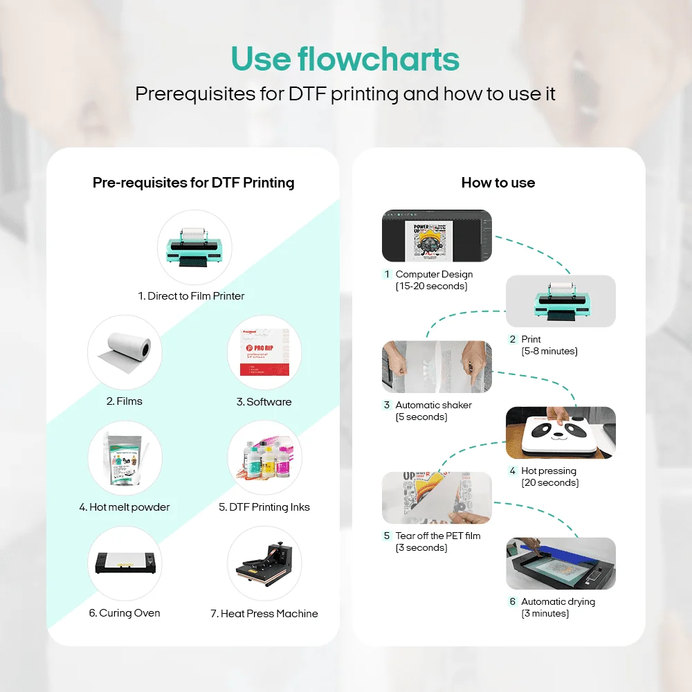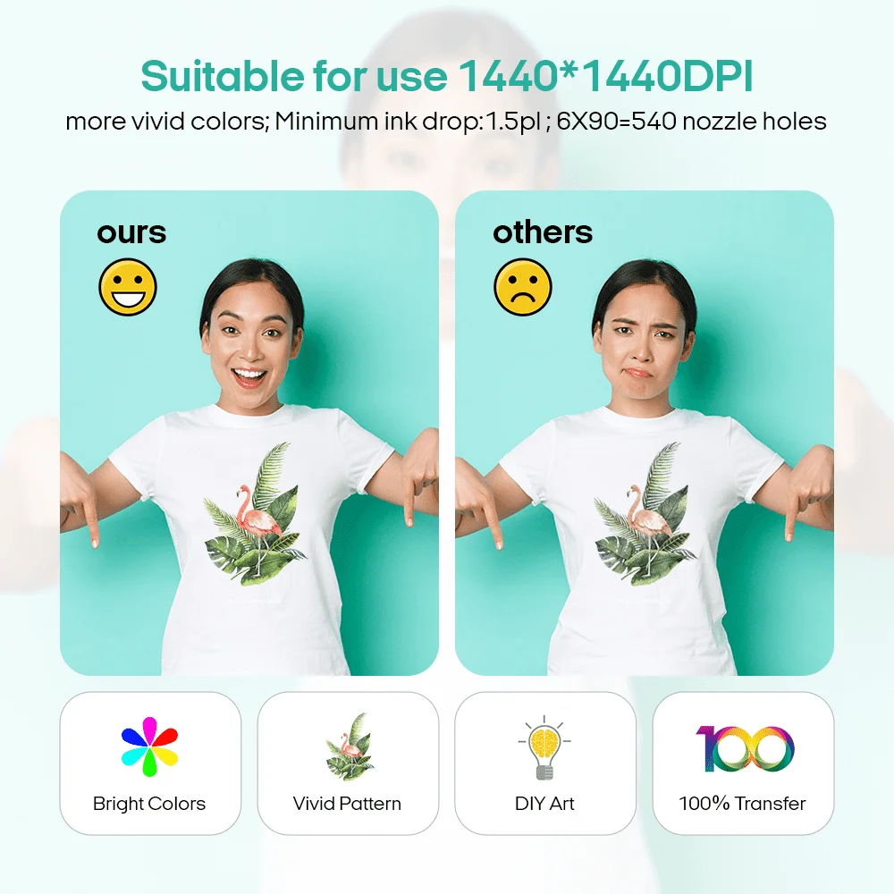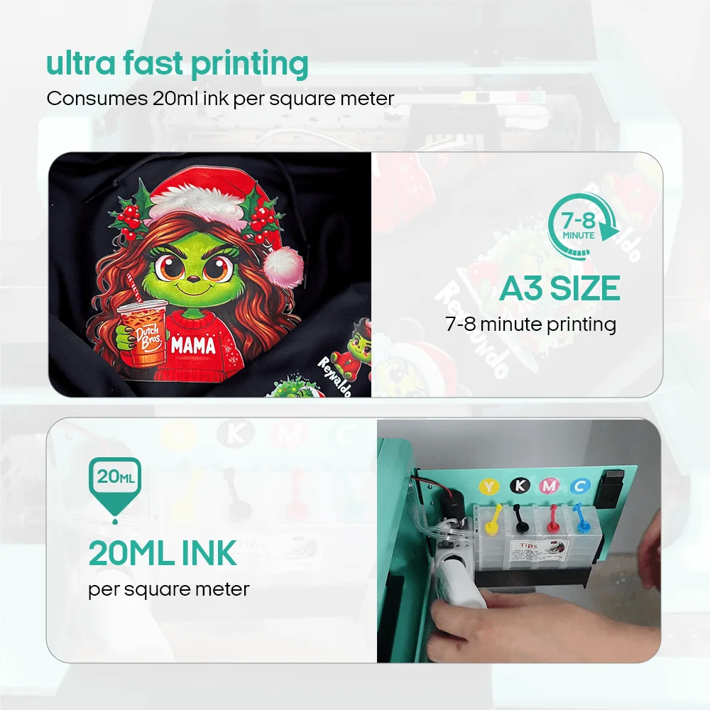 Low ink consumption, Only 20ml ink per square. The most suitable DTF printer for beginners, with fast printing speed, printing multiple patterns at the same time, and lower consumption of ink, the operation is the simplest printer on the market at present