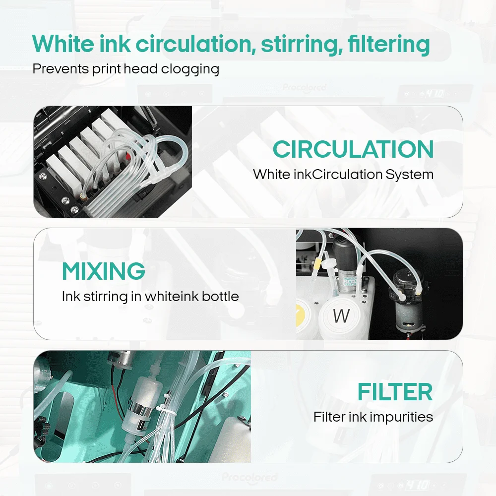 To improve the white ink printing and lower the risk of clogging printhead, we have newly designed a system including stirring, circulation, and filtration systems, which can greatly improve the activity of white ink, make the effect of white ink the best, and reduce the risk of print head clogging, so that the machine can continue to run well and prolong the service life of the machine