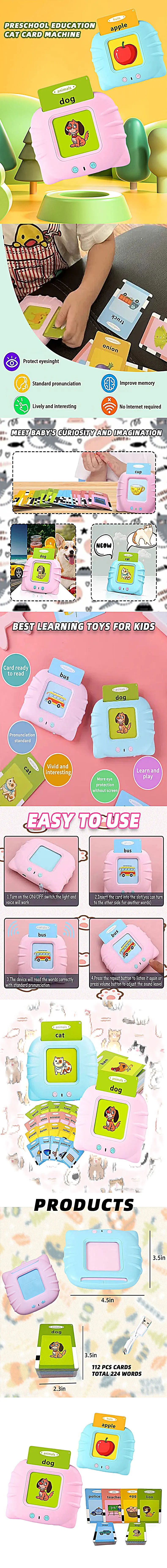 • Educational Content :This flash card machine is designed with a cat-shaped theme, making learning fun and engaging for children. It aids in language acquisition and cognitive skills development.