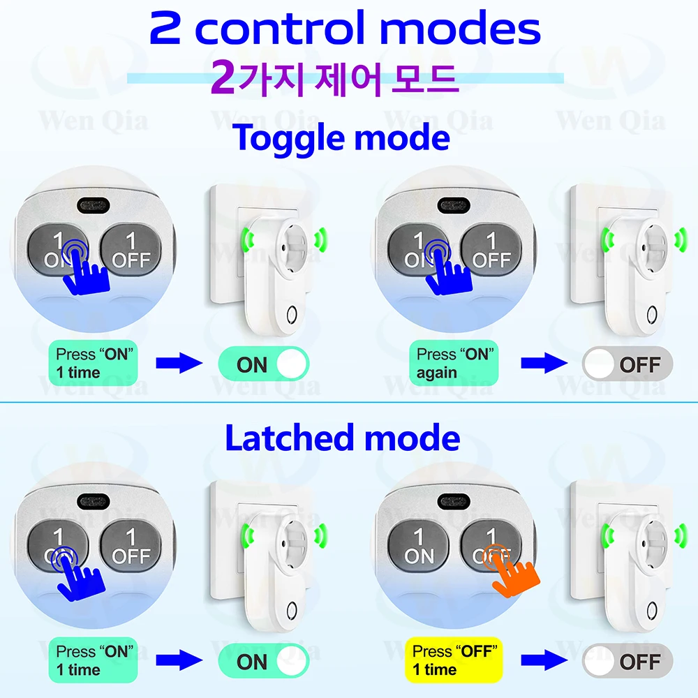 •Latched mode:Press the "ON" button 1 time to turn the socket on, press the "OFF" button 1 time to turn the socket off.
