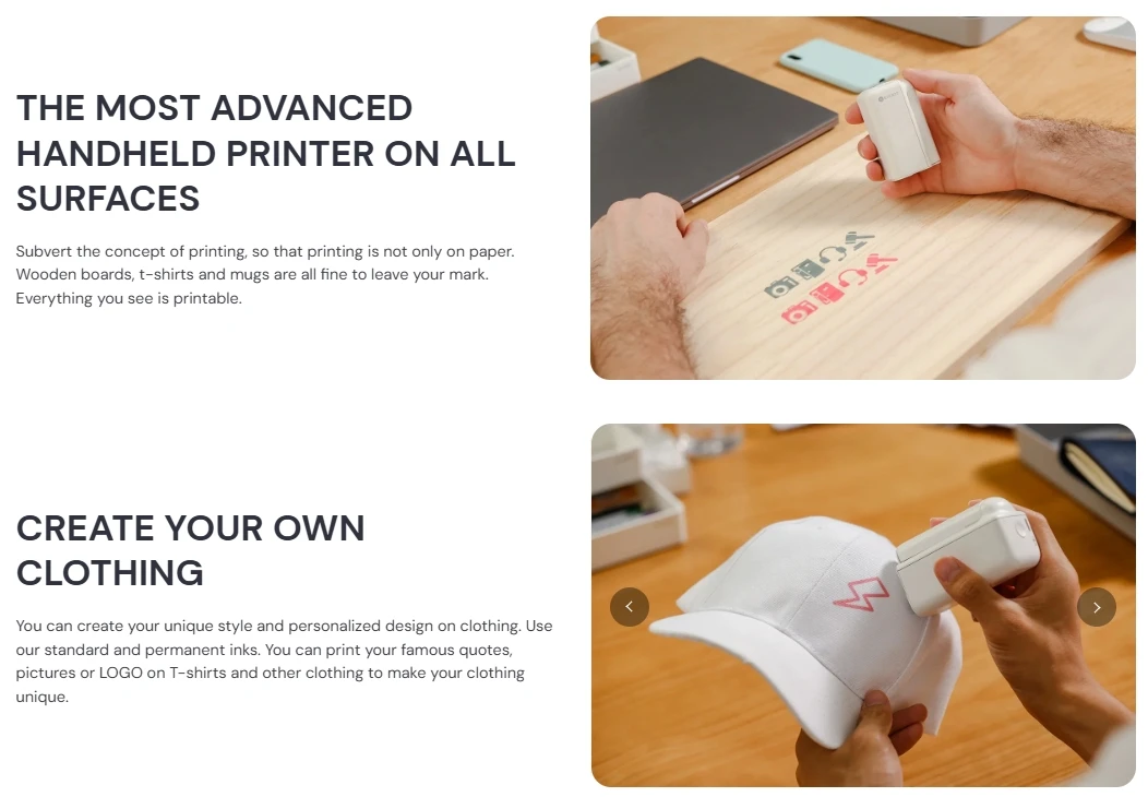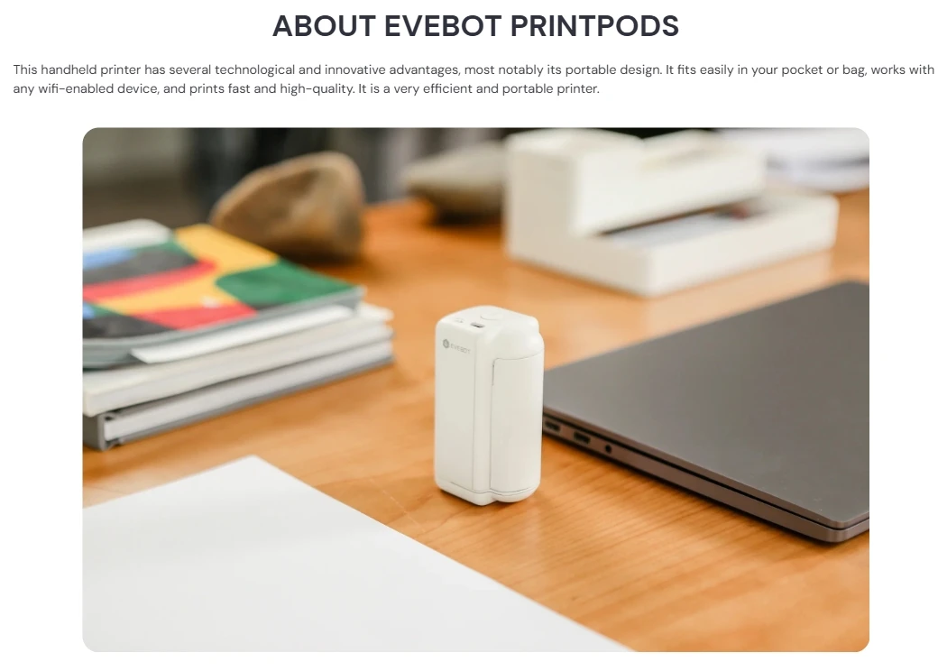 EVEBOT Mini handheld printpods key features The Most Advanced Handheld Printer on All Surfaces.Subvert the concept of printing, so that printing is not only on paper. Wooden boards, t-shirts and mugs are all fine to leave your mark. Everything you see is printable.