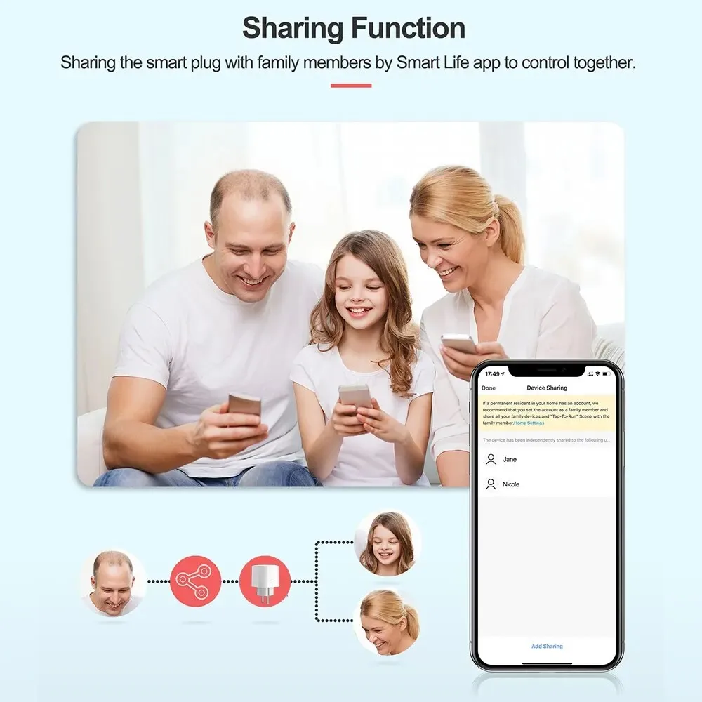 One-tap to share the smart plug with your family member by the app to eliminate extra setup processes.Main account has the exclusive permissions,one click to share the permissions with the whole family.let the family enjoy the fun of smart life!