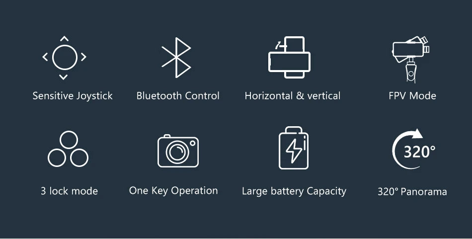Sensitive Joystick/Bluetooth Control/Horizontal & vertical/FPV Mode/3 lock mode/One Key Operation /Large battery Capacity/320° Panorama