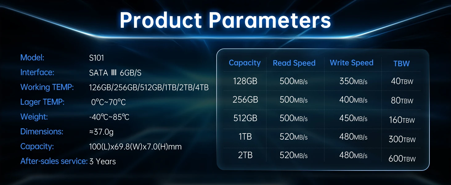 S101-1TB:Sequential Read Speed up to 550 MB/s;Write Speed up to 480 MB/s.Max to 300TBW