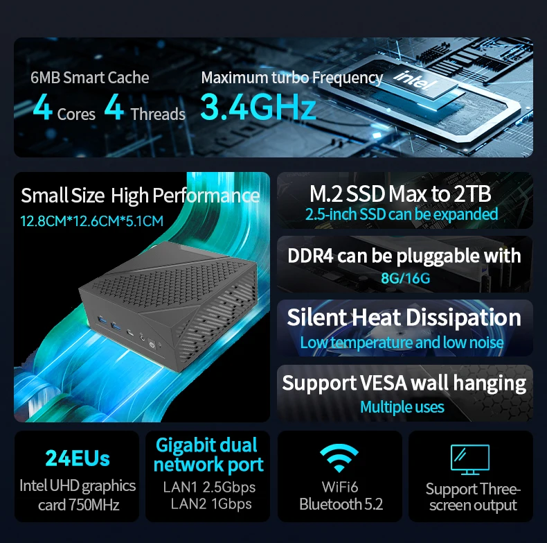• Wifi6 and Bluetooth 5.2 :Equipped with Wifi6 and Bluetooth 5.2, this mini PC allows for fast and stable internet connection and seamless data transfer.