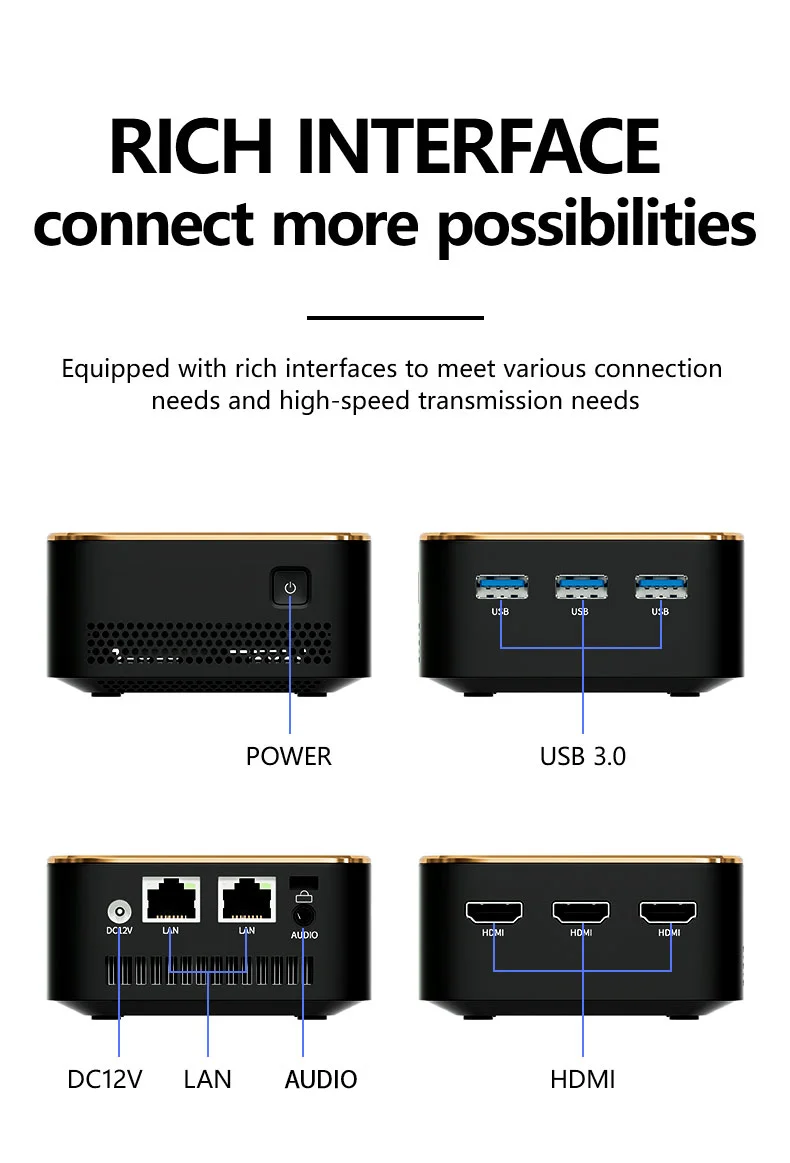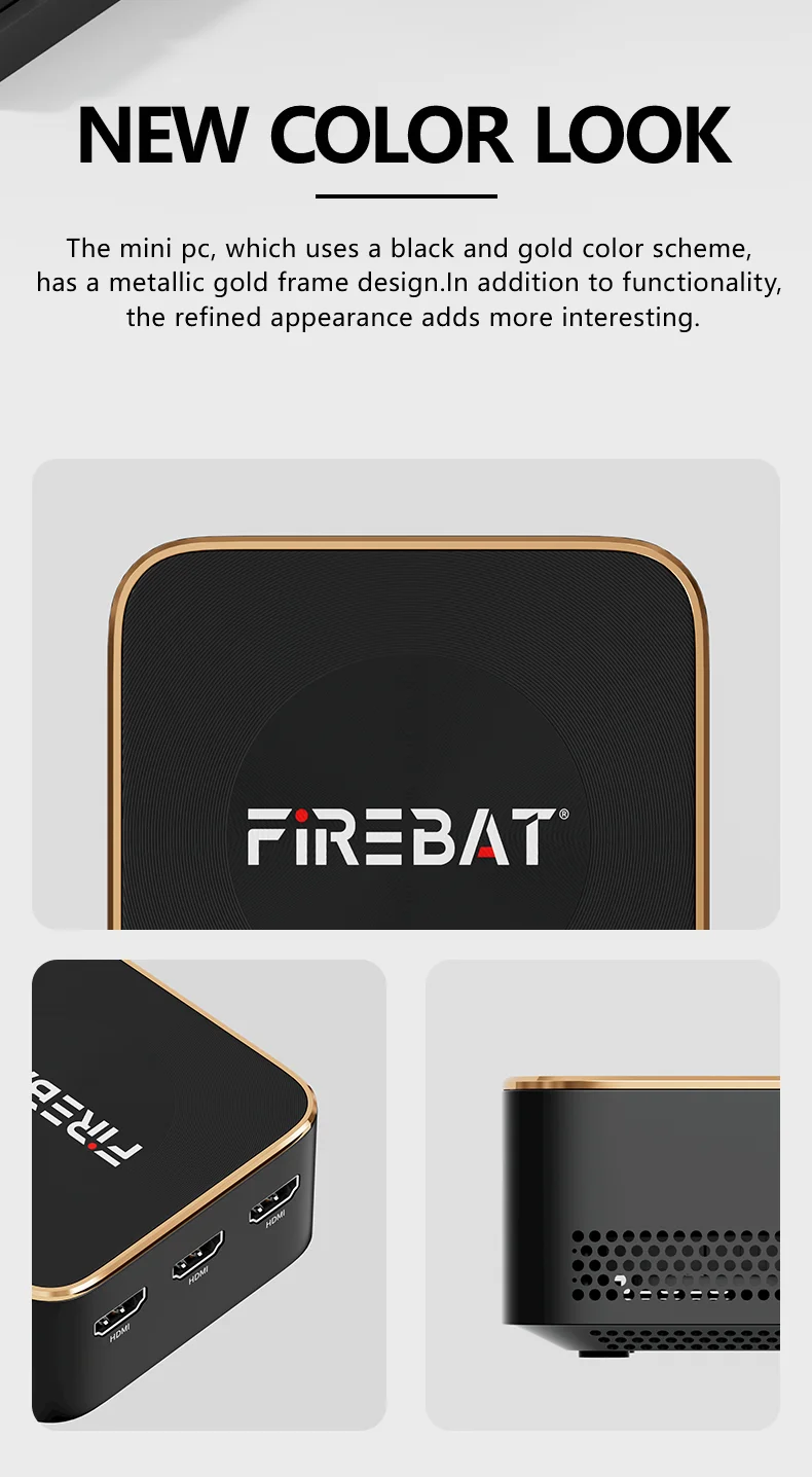 The mini pc, which uses a black and gold color schemehas a metallic gold frame design.In addition to functionality,the refined appearance adds more interesting.