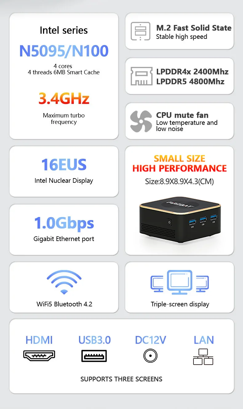 • Powerful Intel Processor :Equipped with an Intel N5095 N100 CPU, this mini PC ensures smooth and efficient operation for all your computing needs.