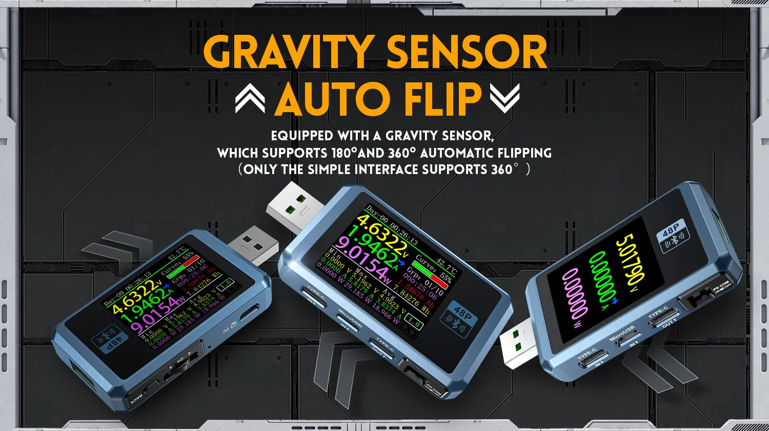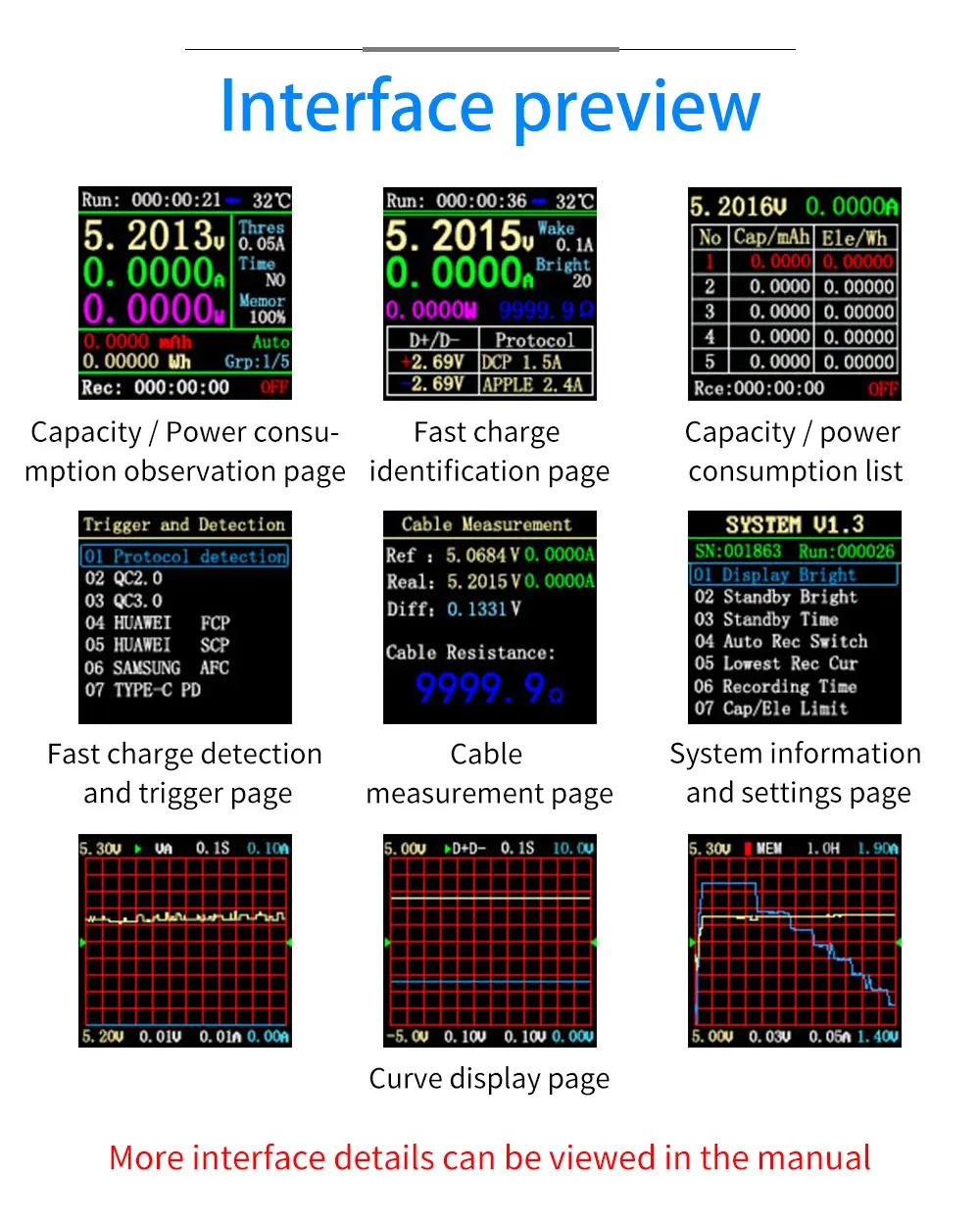 • USB 2.0 interface, 1.44 inch TFT LCD high definition display with integrated USB-A, Micro-USB, Type-C interfaces, use external 16-bit ADC, PD protocol physical chip.