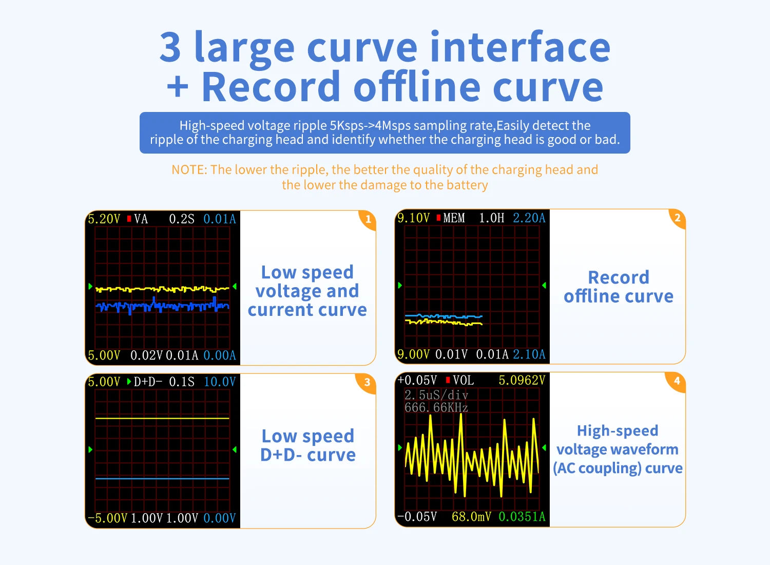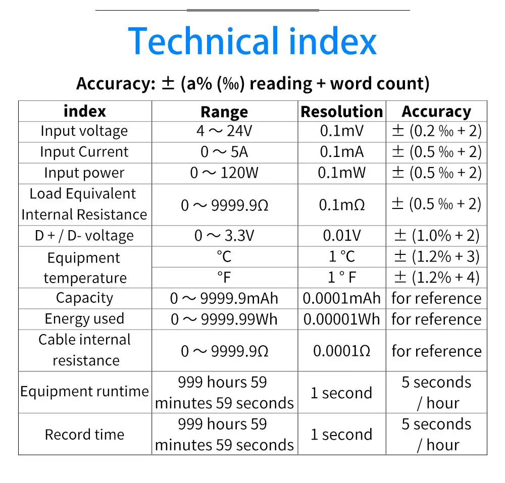• It is a USB tester with high reliability and security for detecting the USB voltage and current and a mobile communication terminal fast charge triggers.