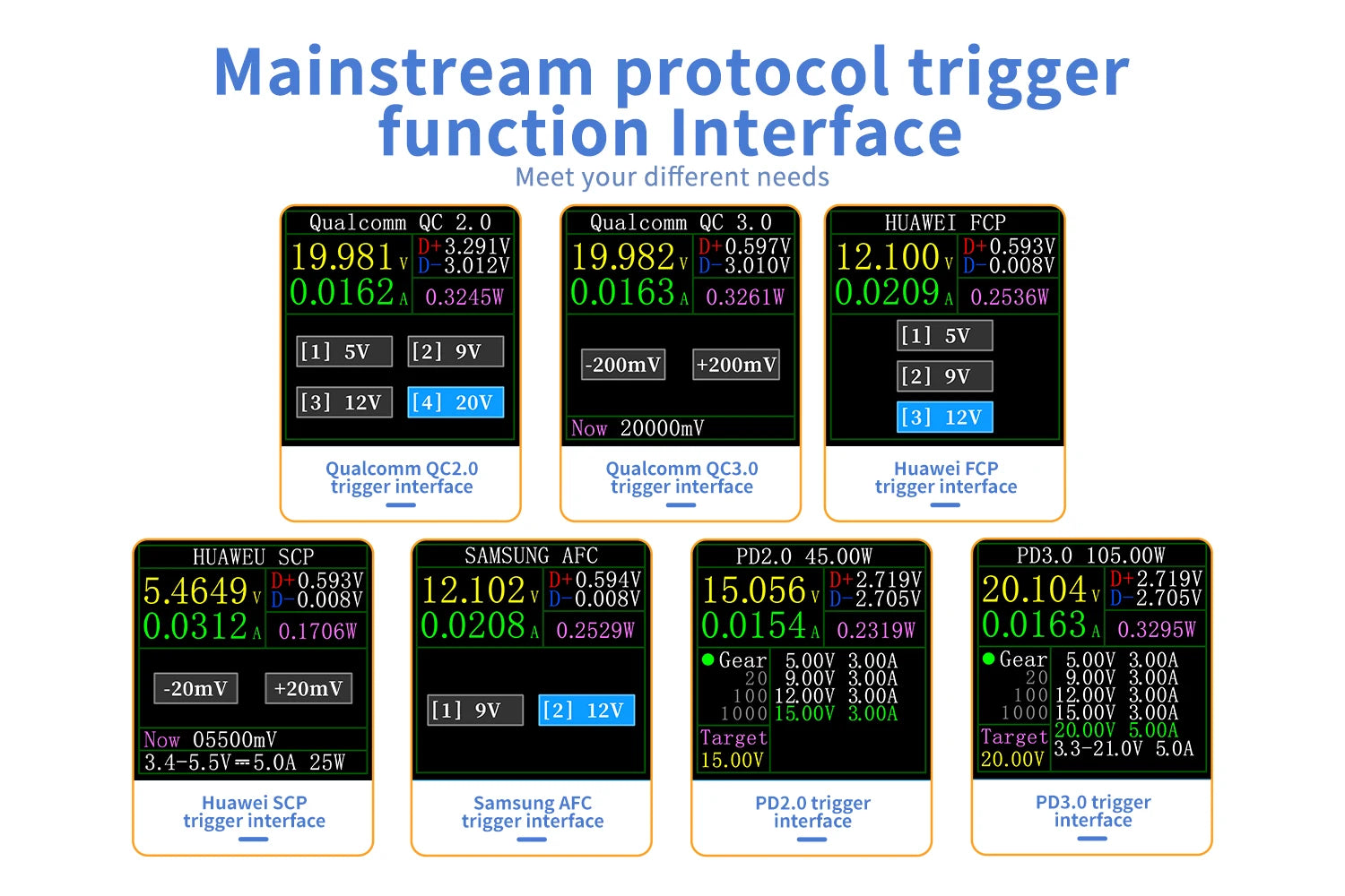 • Can be used for fast charge protocol detection, QC2.0 trigger, QC3.0 trigger, Huawei-FCP trigger, Huawei-SCP trigger, Samsung-AFC trigger, PD protocol trigger, and so on.