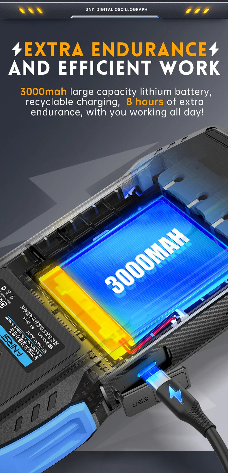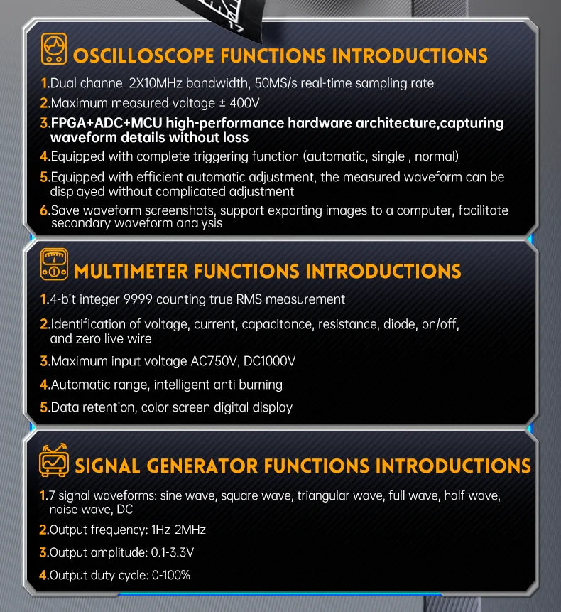 This device is equipped with three main functions of oscilloscope, multimeter, and signal generator.