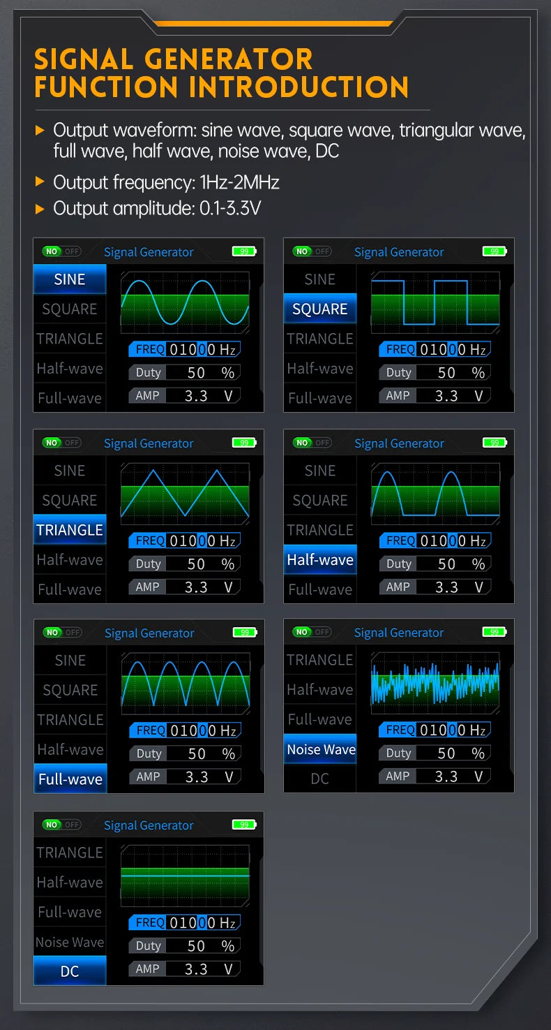 Equipped with a built-in DDS function signal generator, it can output 7 types of function signals, with a maximum output of 2MHz for all signals and a step of 1Hz; The output frequency, amplitude, and duty cycle are adjustable.