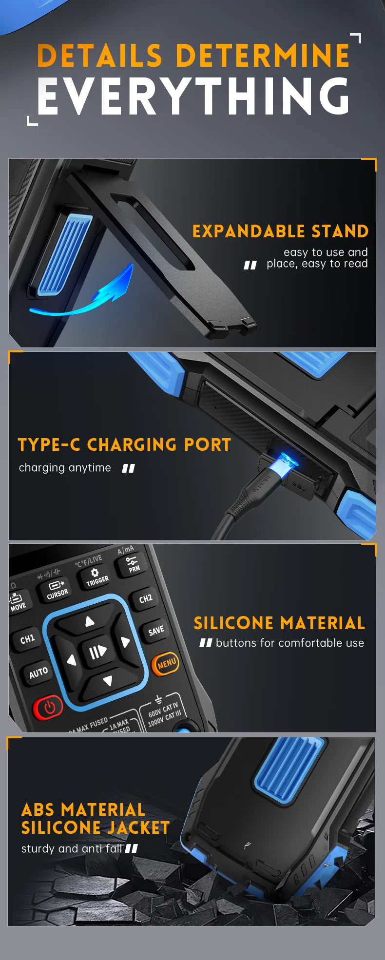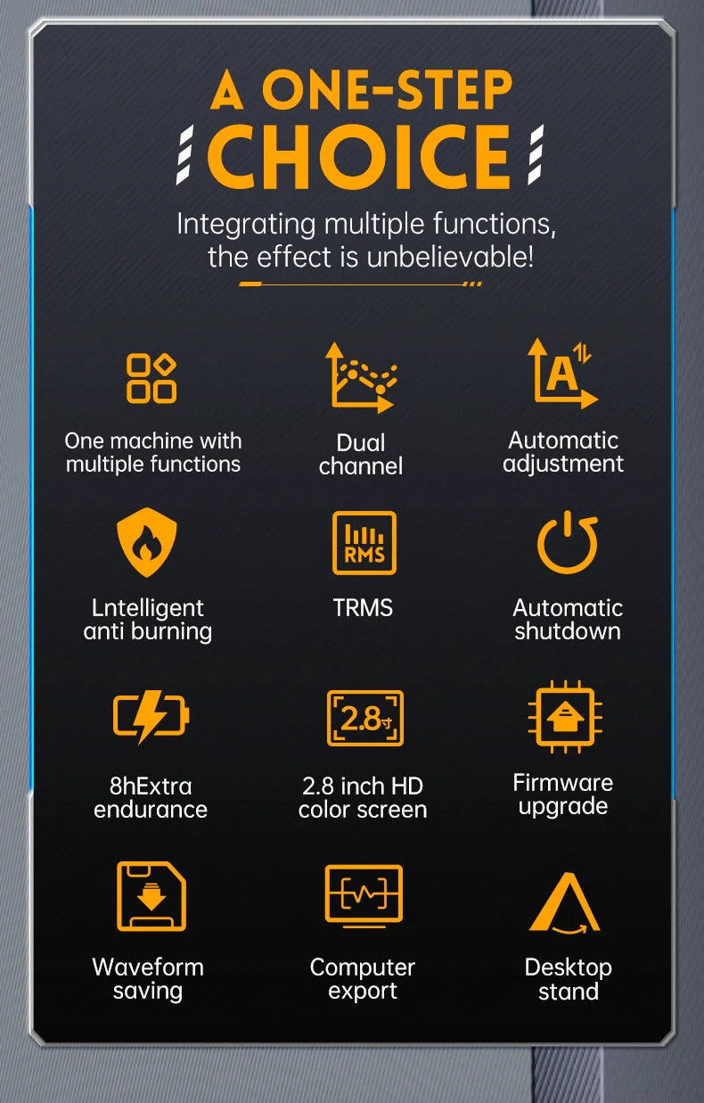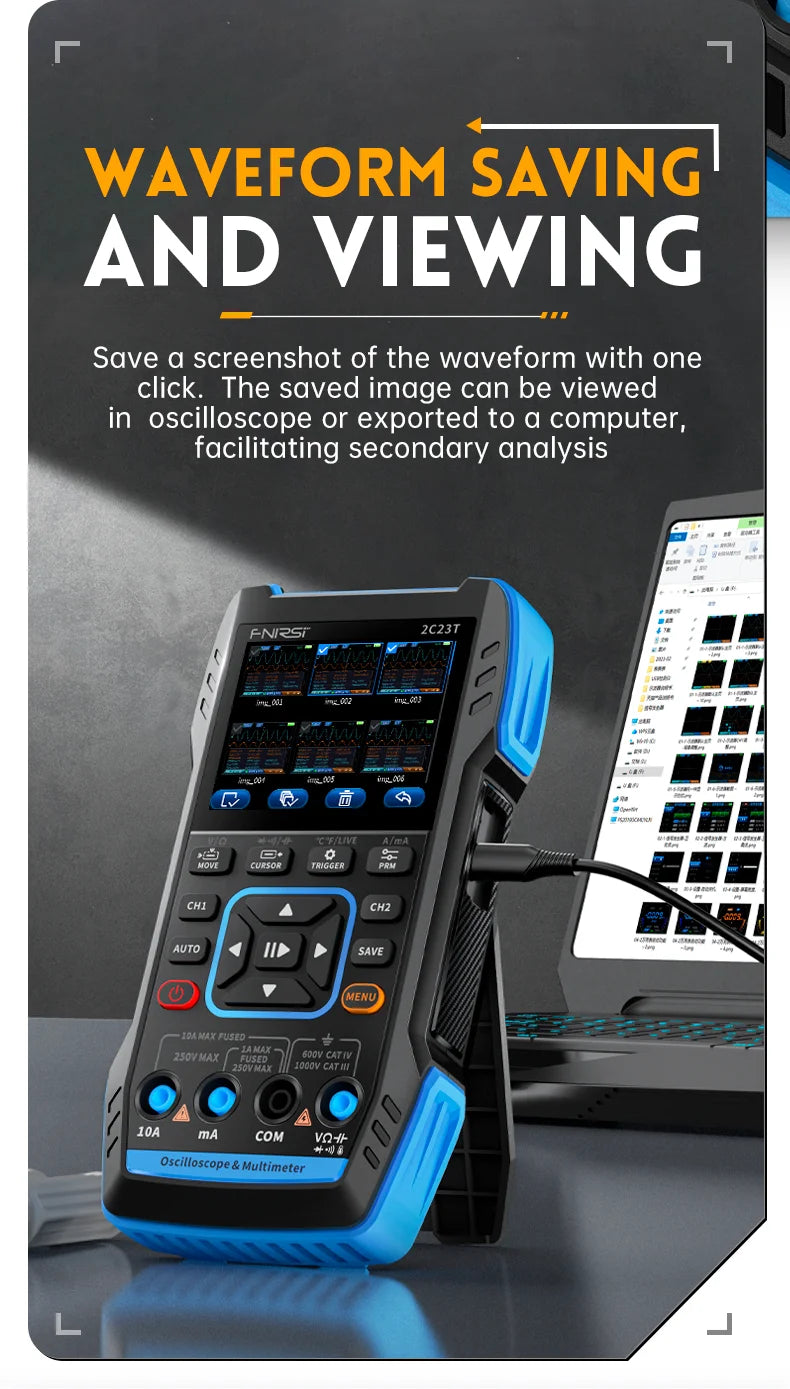 Support for saving and viewing waveform screenshots for analysis .The multimeter has a 4-digit 10000 point true effective value and supports AC/DC voltage and current measurement, as well as capacitance, resistance, diode, on/off and other measurement functions.