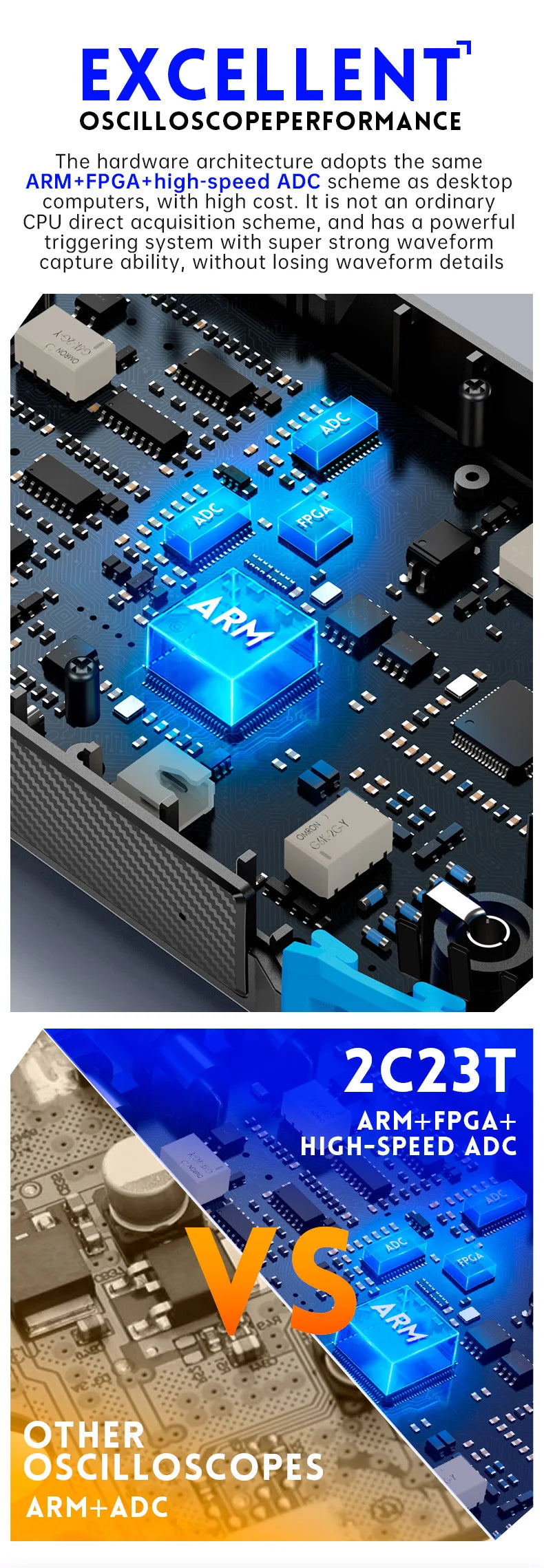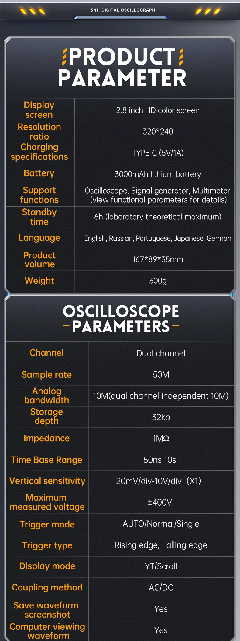The Oscilloscope adopts FPGA+MCU+ADC hardware architecture, with a sampling rate of 50MS/s, 10Mhz analog bandwidth, built-in high-voltage protection module, maximum support measurement of peak voltage of ± 400V;