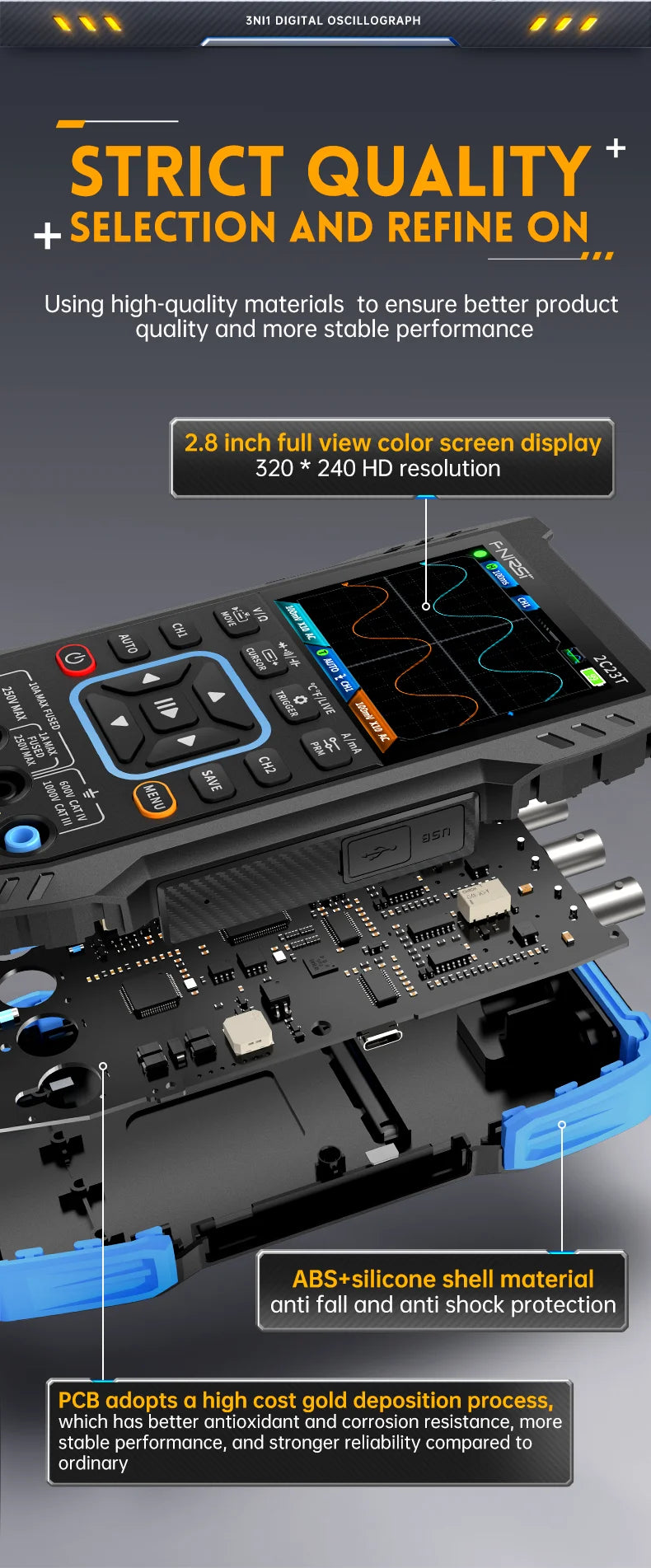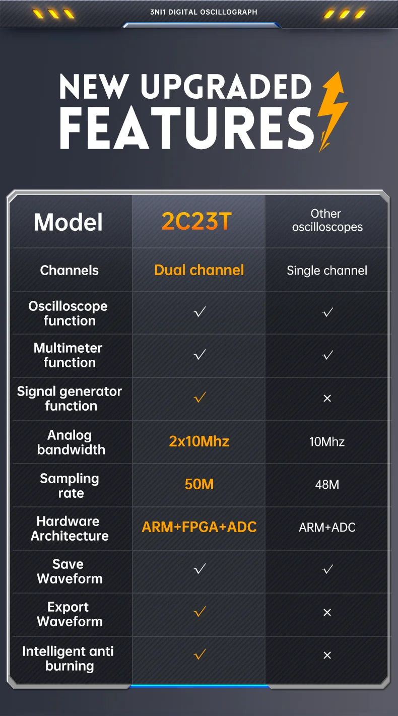 FNIRSI-2C23T is a fully functional, highly practical, three in one dual channel digital oscilloscope designed for the maintenance industry and development industry launched by FNIRSI.