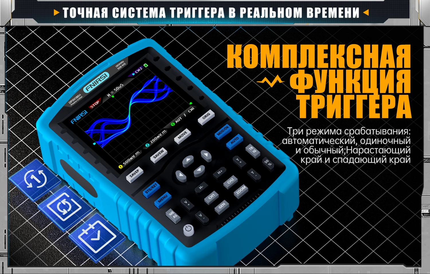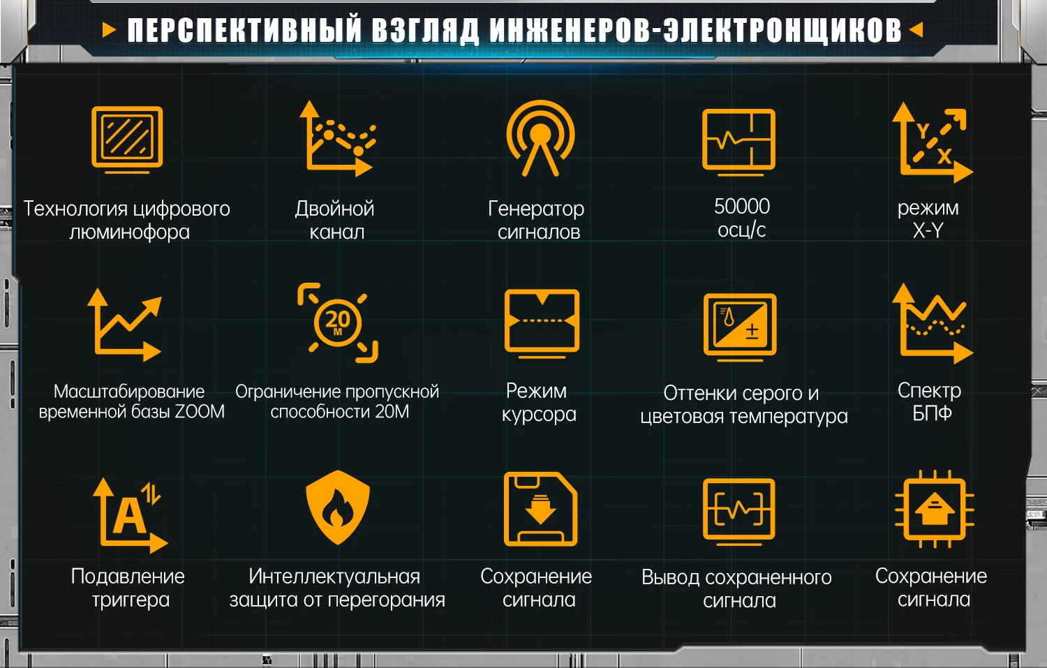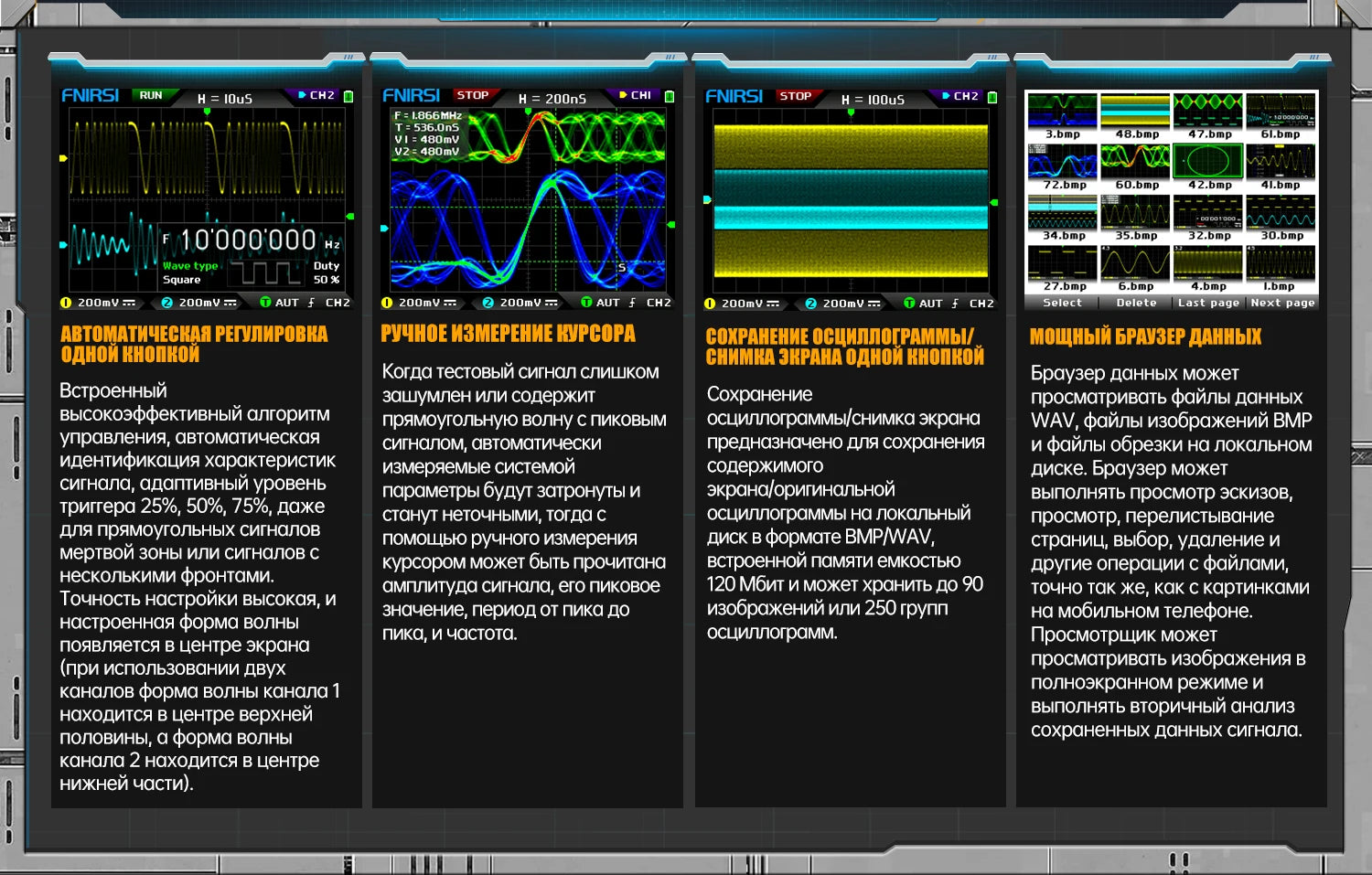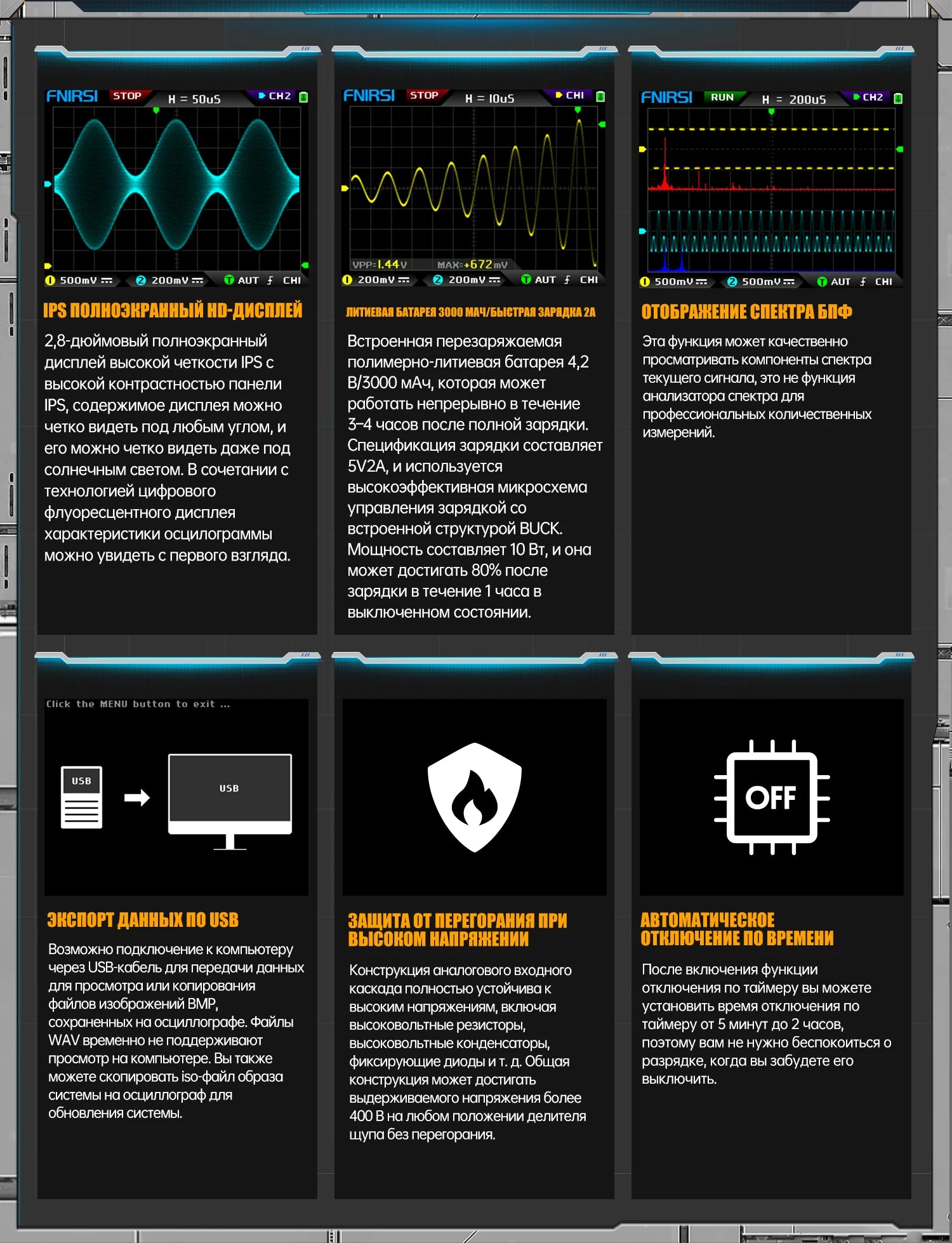 DPOX180H — это экономичный портативный двухканальный Электронные измерительные приборы, выпущенный компанией FNIRSI, с Электронные измерительные приборы и генератором сигналов «два в одном». Электронные измерительные приборы имеет частоту дискретизации в реальном времени 500 MSPS и аналоговую полосу пропускания 180 МГц. Что касается дисплея, то здесь используется высококонтрастный 2,8-дюймовый полноэкранный ЖК-экран IPS. Эффект отображения осцилограммы хороший, а цветопередача — оттенки серого и цветовая температура. Благодаря частоте обновления сигнала до 50000 осц/с легче отображать аномальные сигналы с низкой вероятностью. Система временной базы включает масштабирование временную базы ZOOM для удобного анализа сигналов цифрового протокола. Обладая вертикальной чувствительностью всего 5 мВ, он может лучше измерять слабые сигналы 5 мВпик-пик. Сверхвысокое отношение сигнал-шум, полностью герметичные меры экранирования, стабильная схема обратной связи, чистая и четкая осцилограммы. Оригинальное регулируемое автоматическое ограничение полосы пропускания и адаптивное регулируемое подавление запуска подходят для анализа и измерения сигналов с относительно большими шумами. Аппаратное ограничение полосы пропускания 20M, может отфильтровывать шум выше 20MHz. Триггер использует цифровую технологию триггера с высокой точностью. Имеет три режима срабатывания: автоматический/одиночный/нормальный. Он имеет сильную способность захватывать периодические сигналы, импульсные сигналы и сигналы протокола. Генератор сигналов DDS имеет 14 видов форм сигналов функций и свободно настраиваемый сигнал прерывания. Частота синусоидальной волны может достигать 20 МГц, а другие формы волны могут достигать 10 МГц. Оригинальная функция прерывания вывода может хранить до 500 настраиваемых сигналов. Он имеет три режима временной развертки: YT, XY и скользящий. Ручное курсорное измерение подходит для измерений с сильными шумовыми сигналами. Эффективная автоматическая регулировка одной кнопкой, адаптивный электрический триггер уровня 25%, 50%, 75%, для измерения 1VPP/1KHz требуется всего 2 секунды. Сохраняйте сигналы и снимки экрана с помощью одной клавиши, можно сохранить до 250 наборов данных о сигналах или 90 изображений, и одновременно можно сохранить 500 перехваченных данных о сигналах. Браузер данных может просматривать сохраненные в данный момент данные формы волны и изображения, а данные осцилограммы поддерживают такие операции, как масштабирование и перемещение. Защита от возгорания при высоком напряжении, все диапазоны выдерживают высокое напряжение до 400В. Экспорт данных USB, вы можете подключиться к компьютеру для копирования файлов изображений, а также вы можете копировать системные файлы на Электронные измерительные приборы для обновления системы. Быстрая зарядка 5V2A, и 1 час может зарядить до 80%.