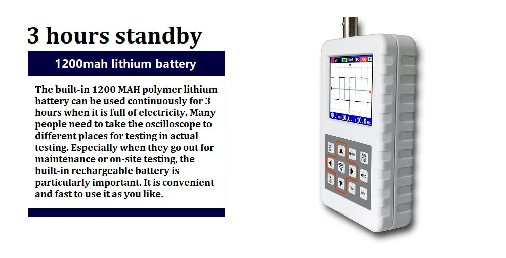DSO FNIRSI PRO is a full function, high utility, high performance and cost-effective handheld oscillograph for the maintenance industry and the R & D industry. The oscillograph has a real-time sampling rate of up to 20MS/s and a 5MHz analog bandwidth. With complete triggering function (single, normal, automatic), both the periodic analog signal and the aperiodic digital signal can be used freely. Large time base scanning mode can monitor slow level changes. Equipped with high efficiency one button AUTO, the measured waveform can be displayed without complicated adjustment. Display the High Definition LCD screen equipped with 2.4 inch 320*240 resolution. Extremely convenient and fast waveform storage function, built-in 16MB storage space, the maximum storage of 500 waveform pictures. Powerful waveform file manager, support thumbnail browsing, viewing, details view, flip, delete and other functions. Built in 1200mAh rechargeable lithium battery can be continuously charged for 3 hours at one time. Day mode and night mode can be changed according to their own preferences.